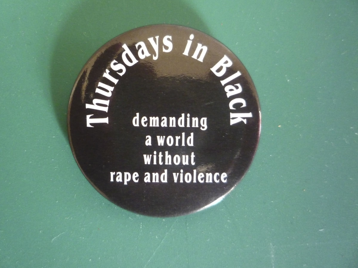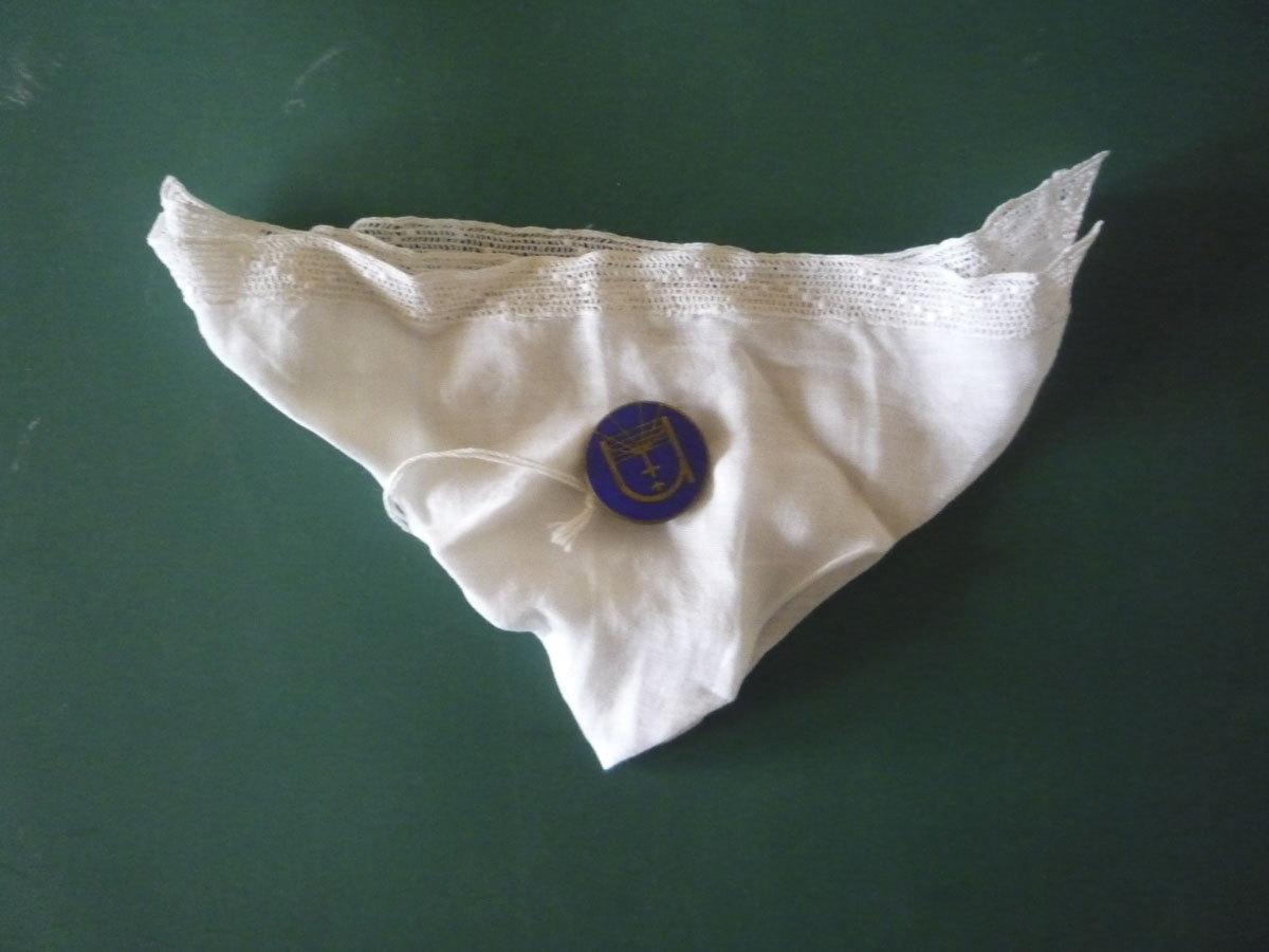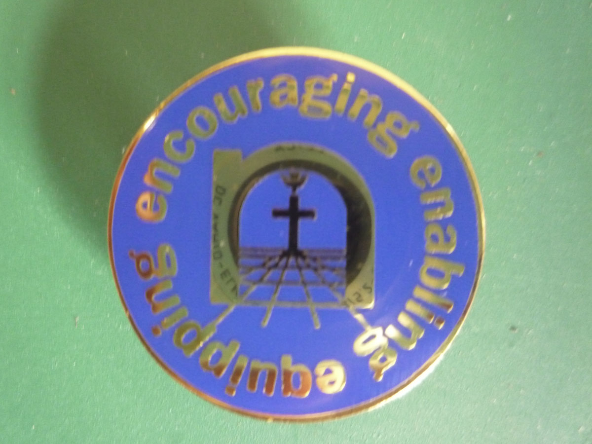 Brass lapel badge coloured red, white and gold in the shape of a rounded Maltese Cross with a white ribbon intersecting the arms. The edges are outlined in gold...