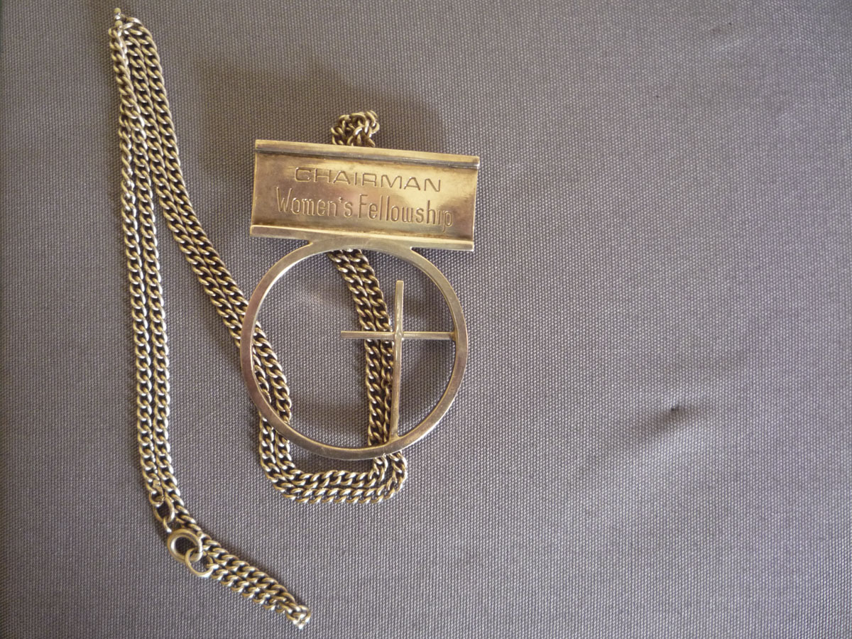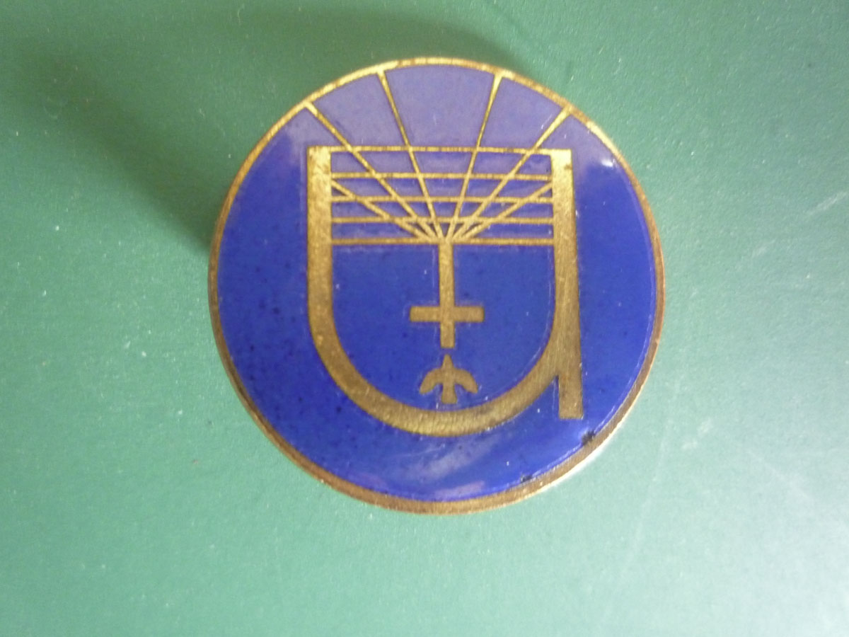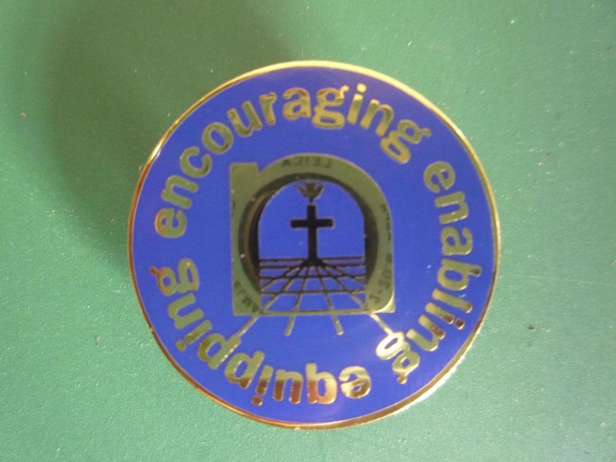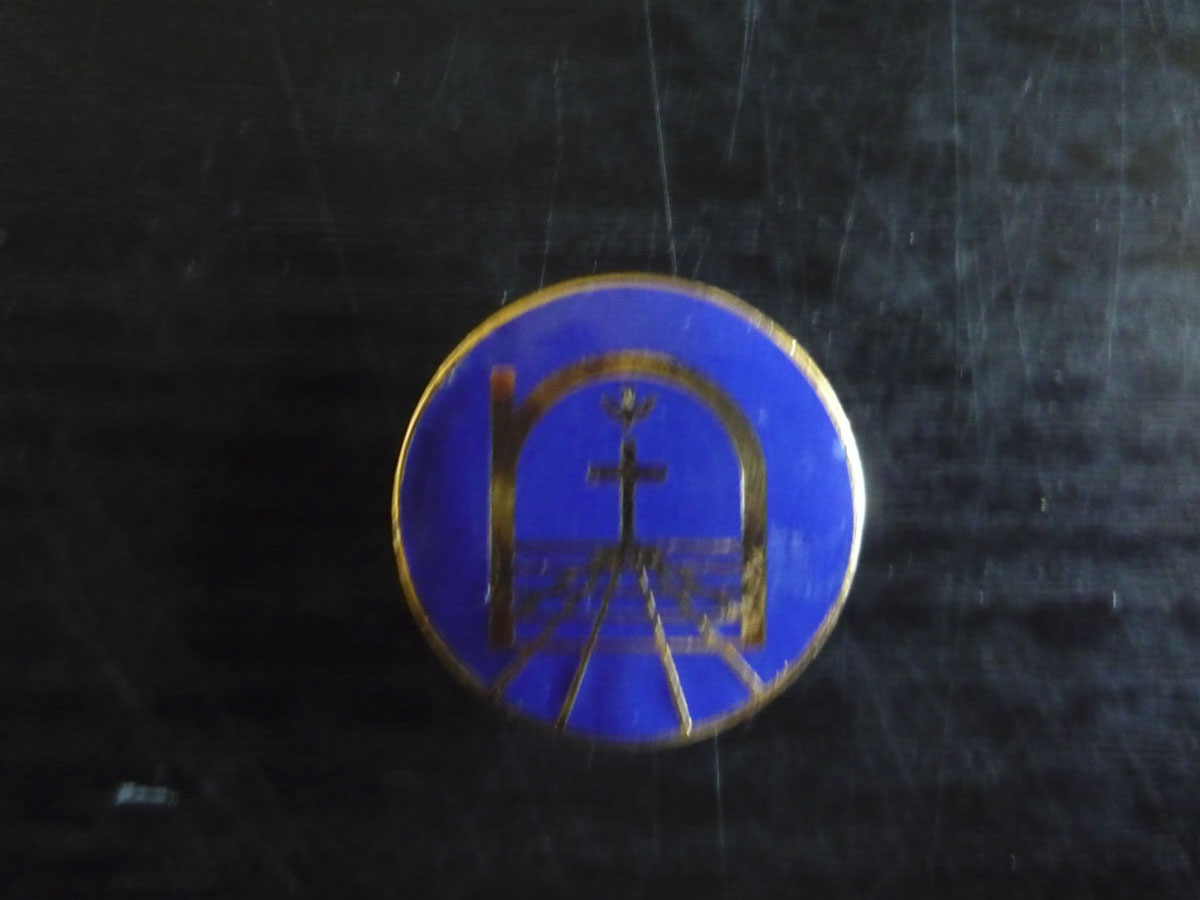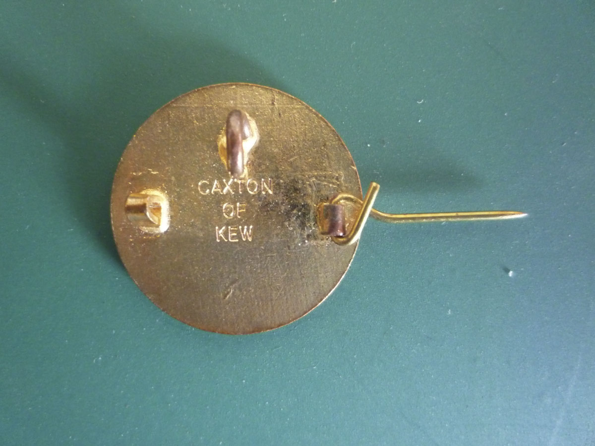 Lapel badge with Richmond College coat of arms. There is a red background on which is a white cross. On the cross is a shell in the centre with...