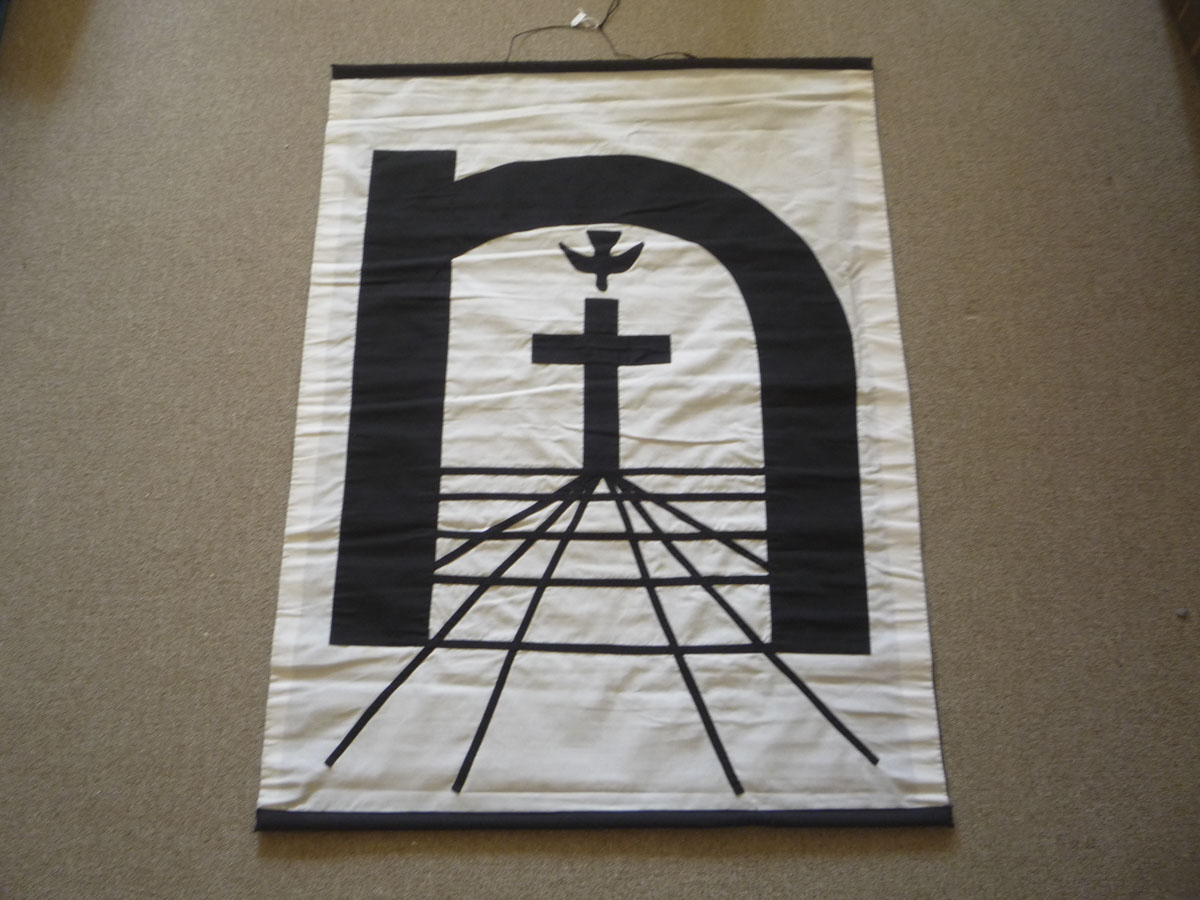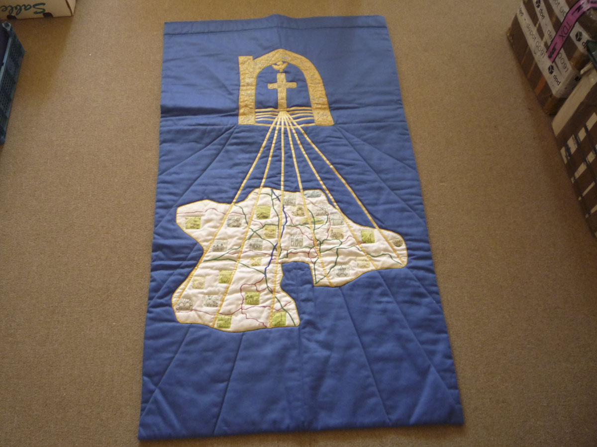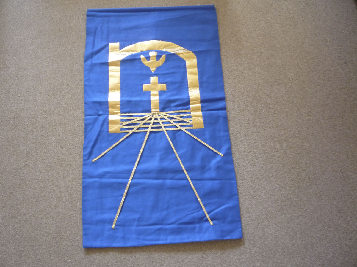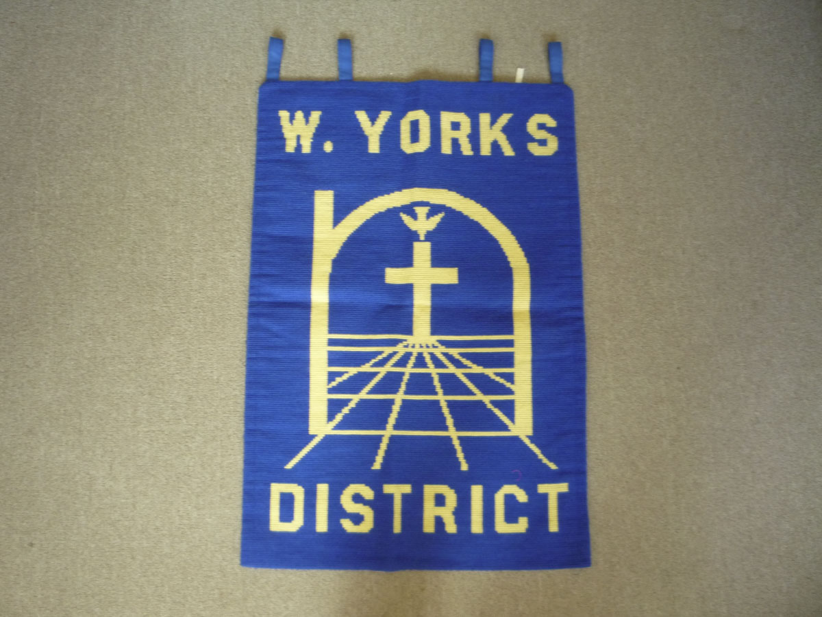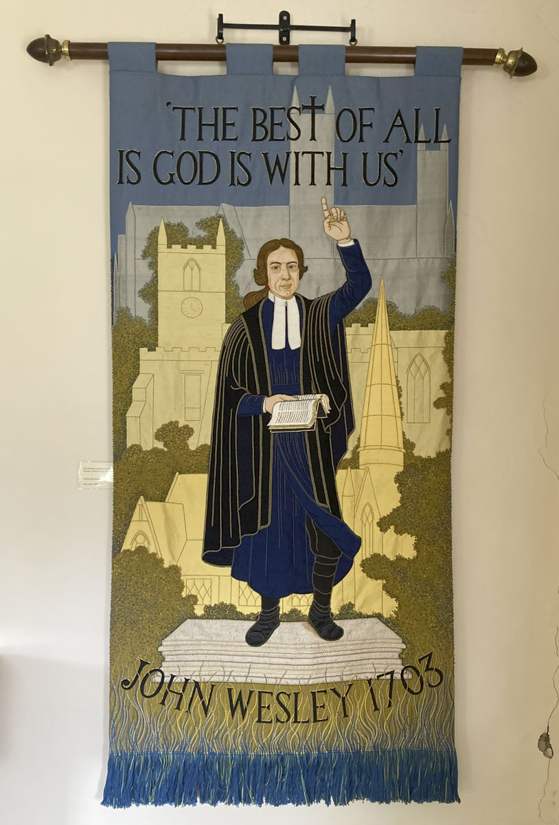 A coloured embroidered and applique worked banner with a blue fringe. The banner is hanging from a wooden cross pole with brass pineapple ferrules. The figure of John Wesley is...