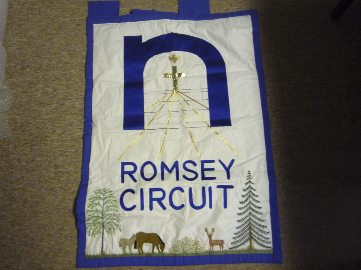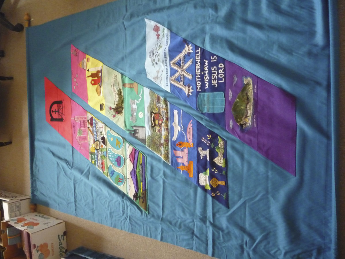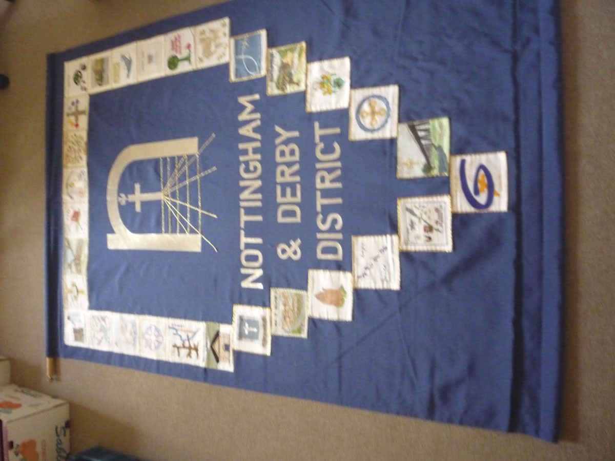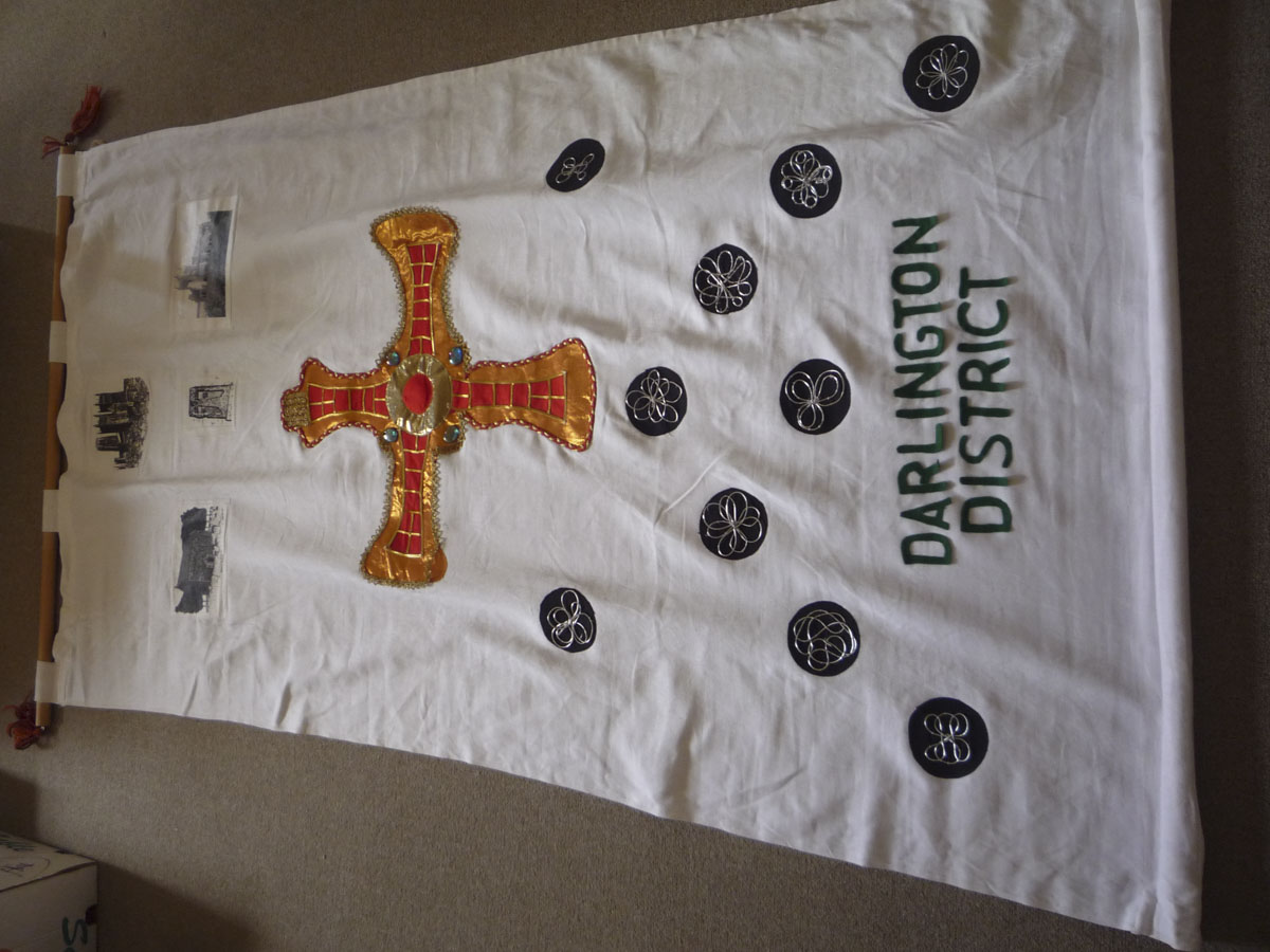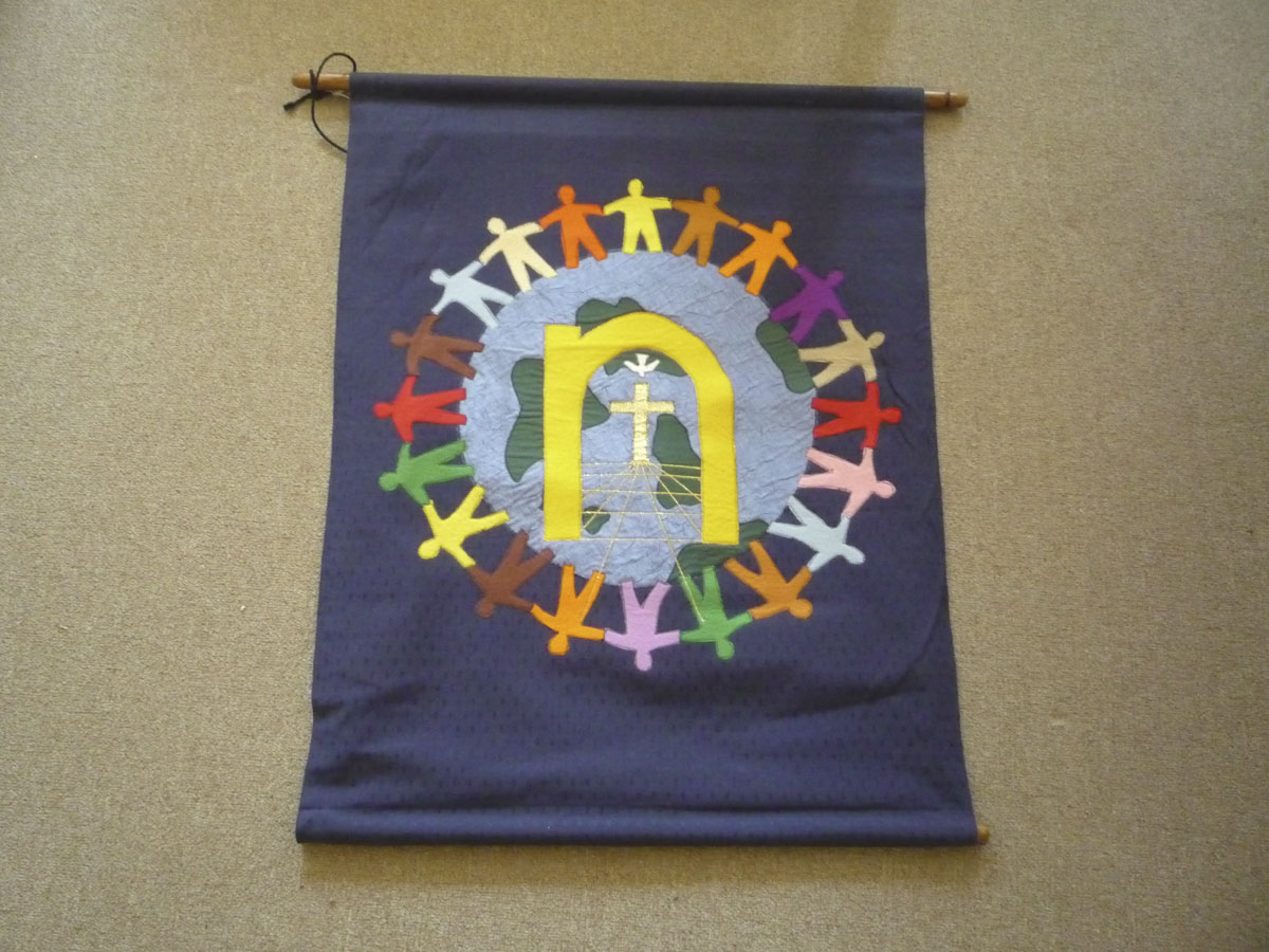 A coloured embroidered and applique worked banner with a blue fringe. The banner is hanging from a wooden cross pole with brass pineapple ferrules. The figure of John Wesley is...