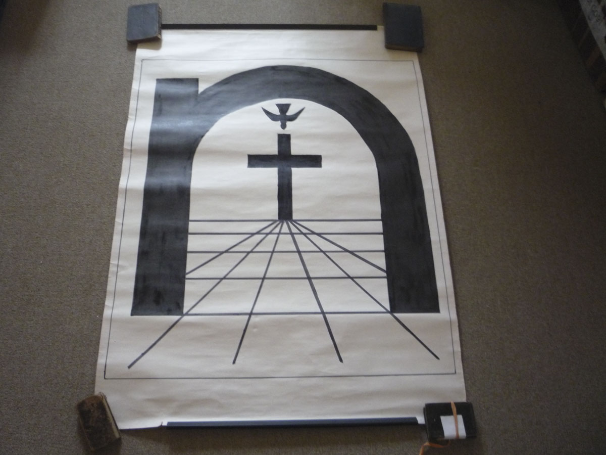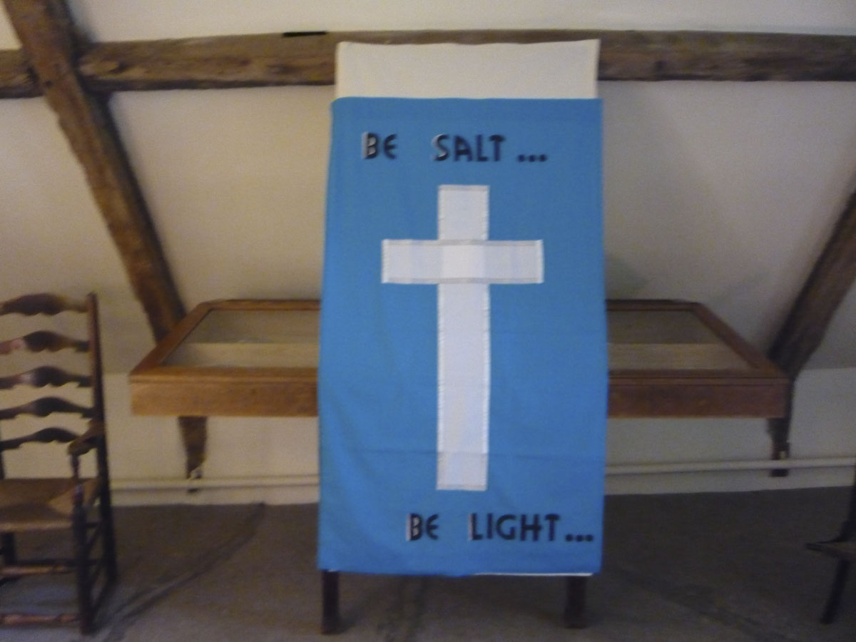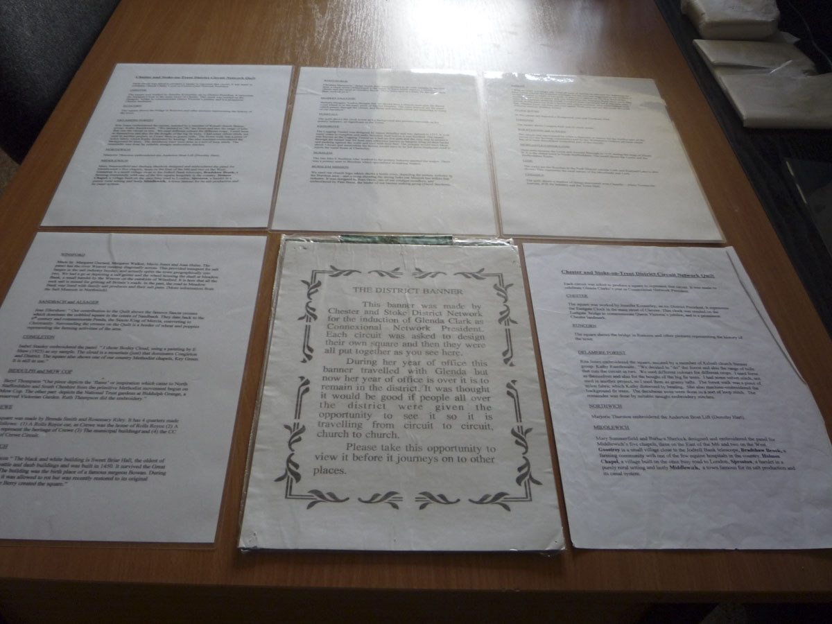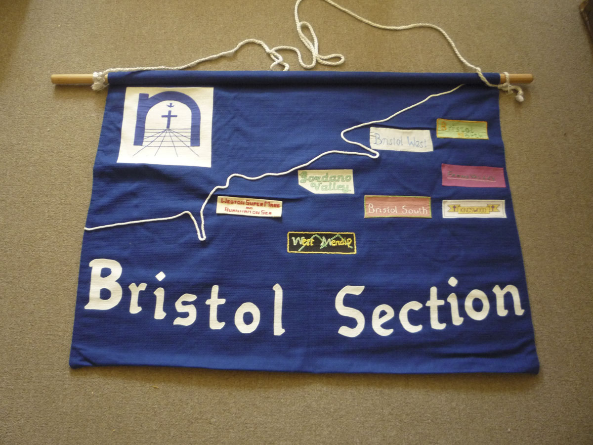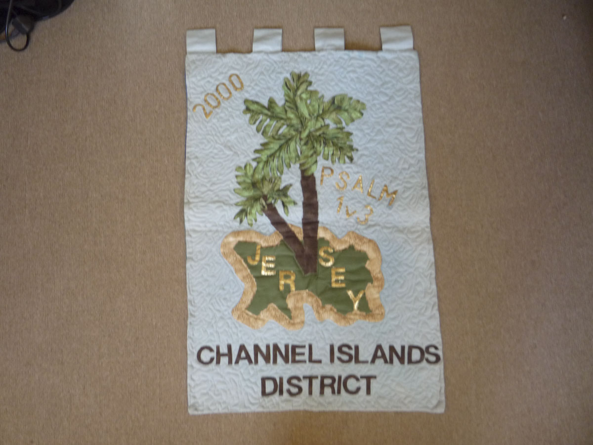 A coloured embroidered and applique worked banner with a blue fringe. The banner is hanging from a wooden cross pole with brass pineapple ferrules. The figure of John Wesley is...