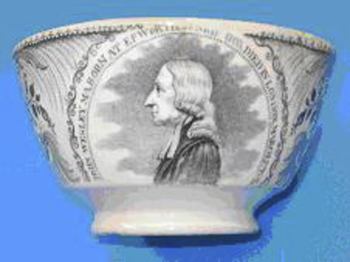 Earthenware bowl with 14 sides and black transfer prints of John Wesley on one side and the Centenary Hall on the other. All around are doves and floral sprays....