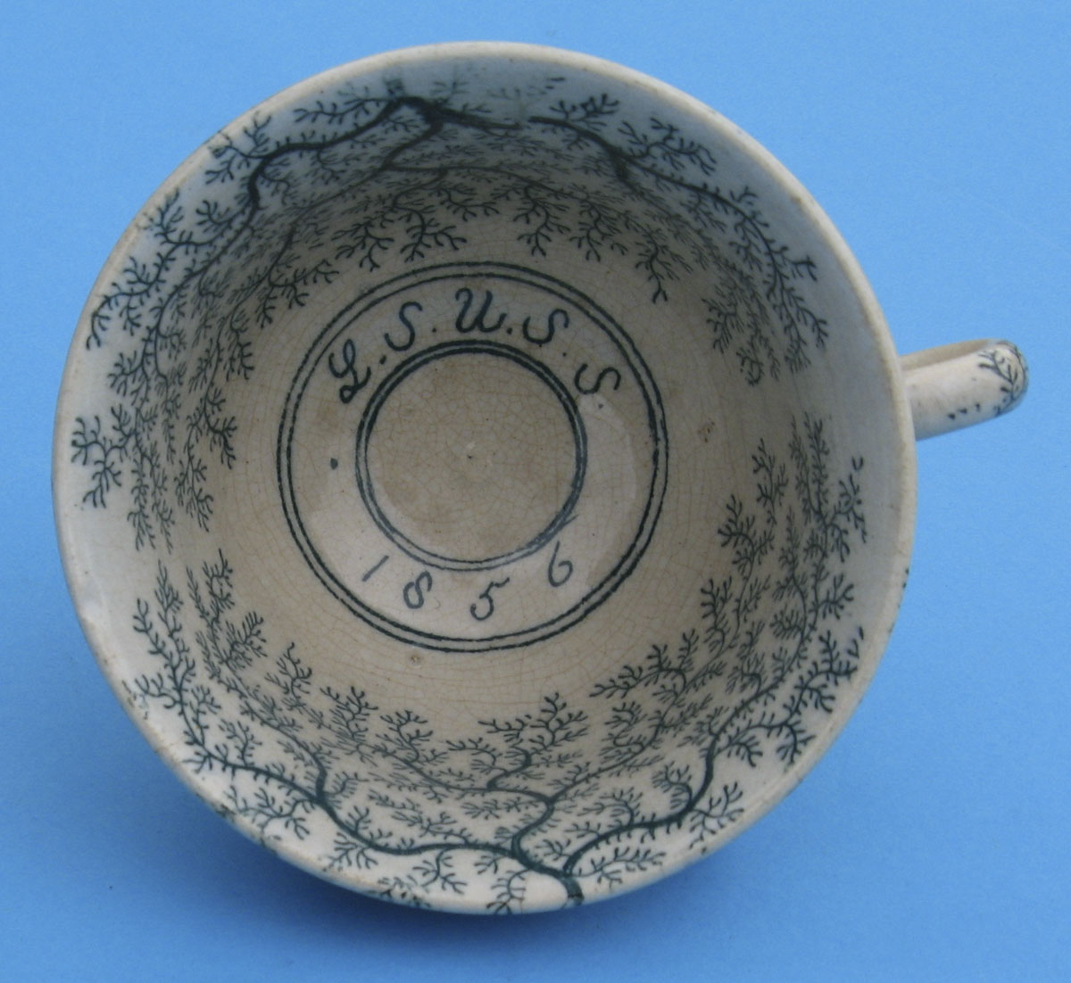 Earthenware round bowl with black transfer prints of John Wesley on one side and the Centenary Hall on the other. All around are doves and floral sprays. Inside the...