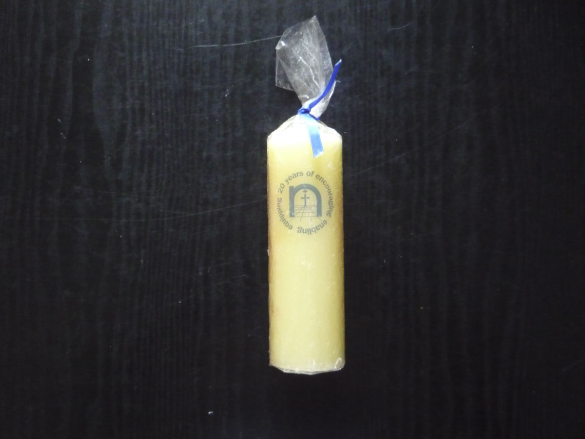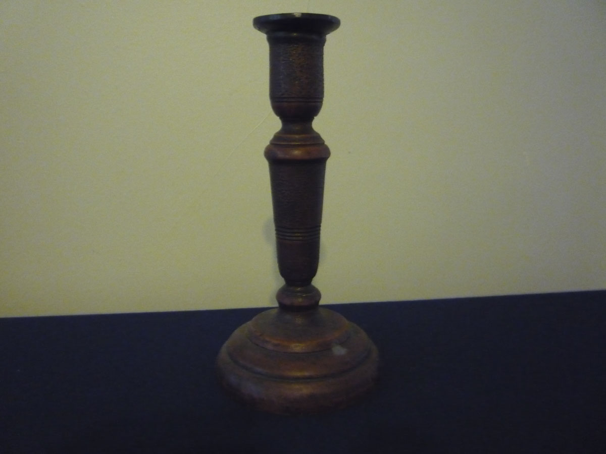 Brass candlestick with an accompanying candle snuffer (2000-016b). The base is oblong and the candle holder is a tube with a square sconce. There is a circular handle with...