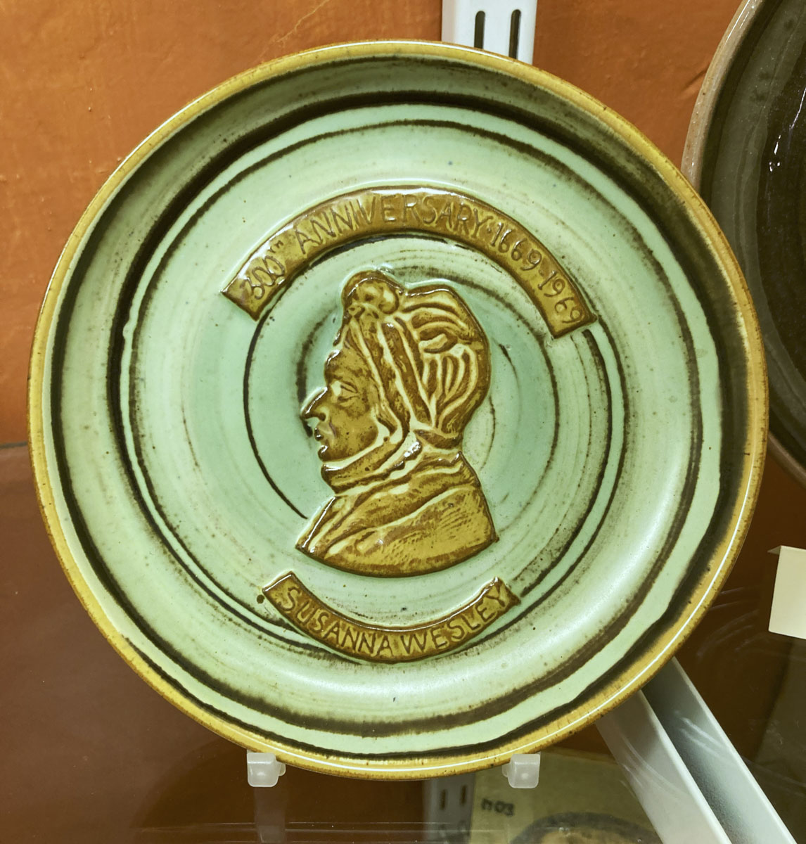Round green earthenware dish with bas relief profile of a woman facing left. The subject is Susanna Wesley (1669-1742)