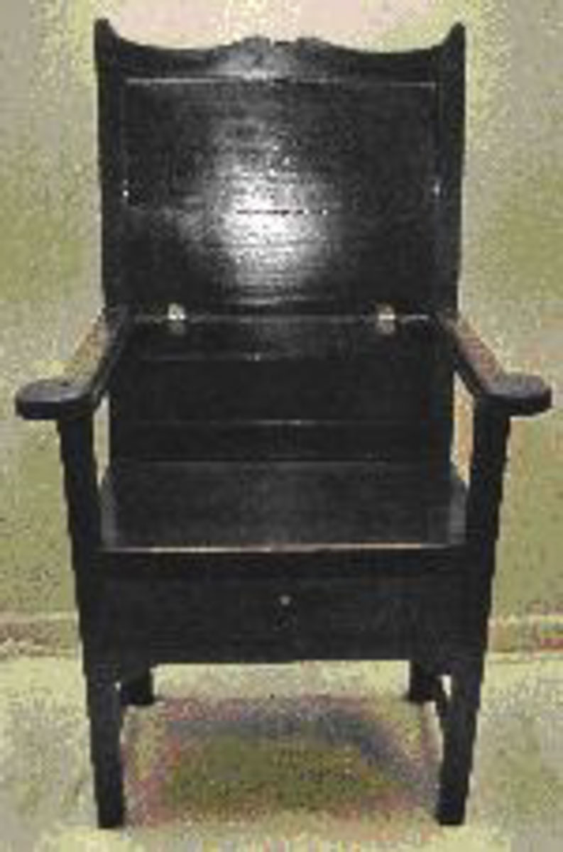 Oak "prayer" chair. The back comprises two sections the lower being a solid splat and the upper being a 2 plank hinged panel which lets down as a table and...