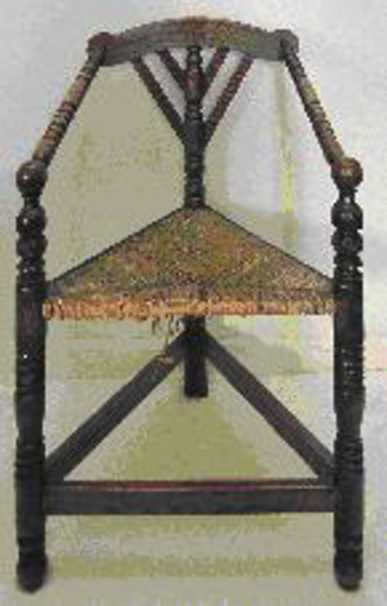 Ash Thrown corner chair with central column back and 4 chevron turned splats. The seat is triangular and made of rush. There are three turned bobbin legs and...