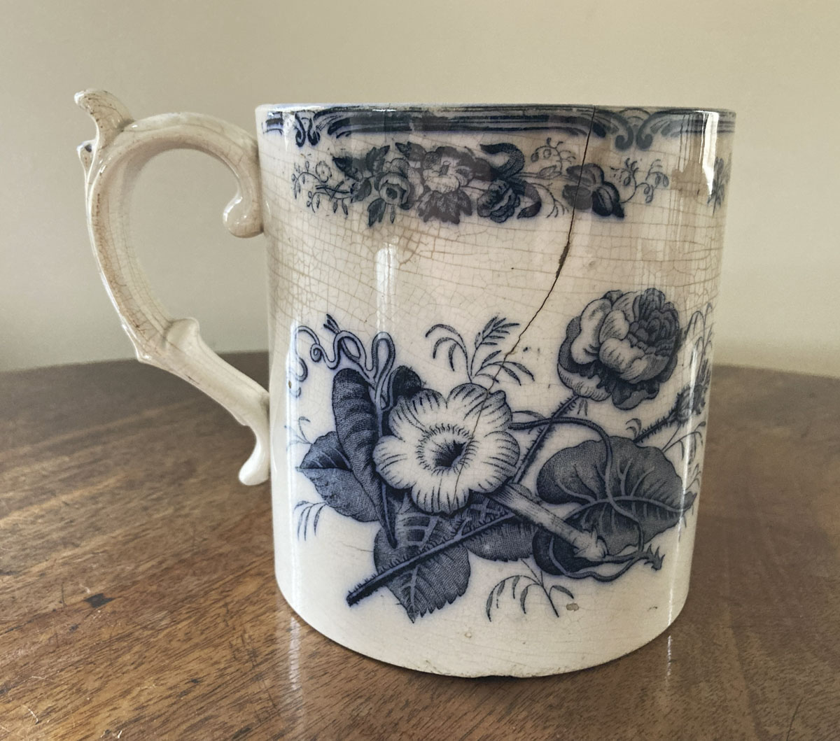 Earthenware mug with straight sides and one ear-shaped handle with a thumb rest. It has a blue transfer print pattern and there are three earthenware figures inside the mug -...