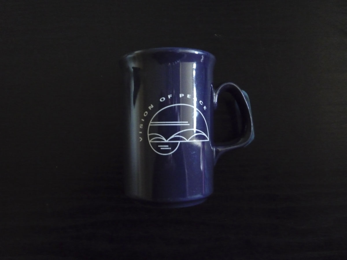 Earthenware mug showing a laurel reef with in the middle an image of a church with a tower. The church depicted is the Middle Village and Forest Hills United Methodist...