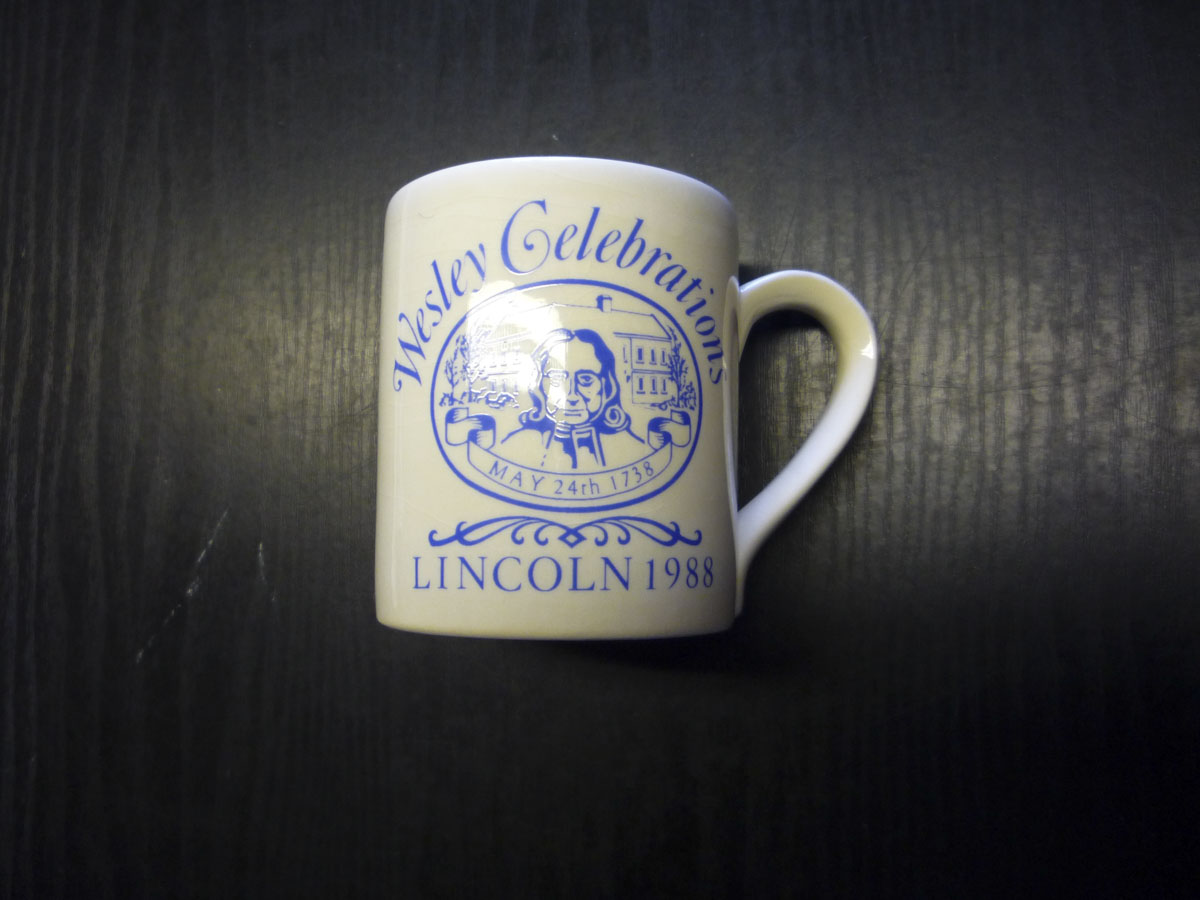 Earthenware straight sided beaker with black transfer prints of John Wesley on one side and Centenary Hall on the other. Decorated with floral sprays. The handle is angular...