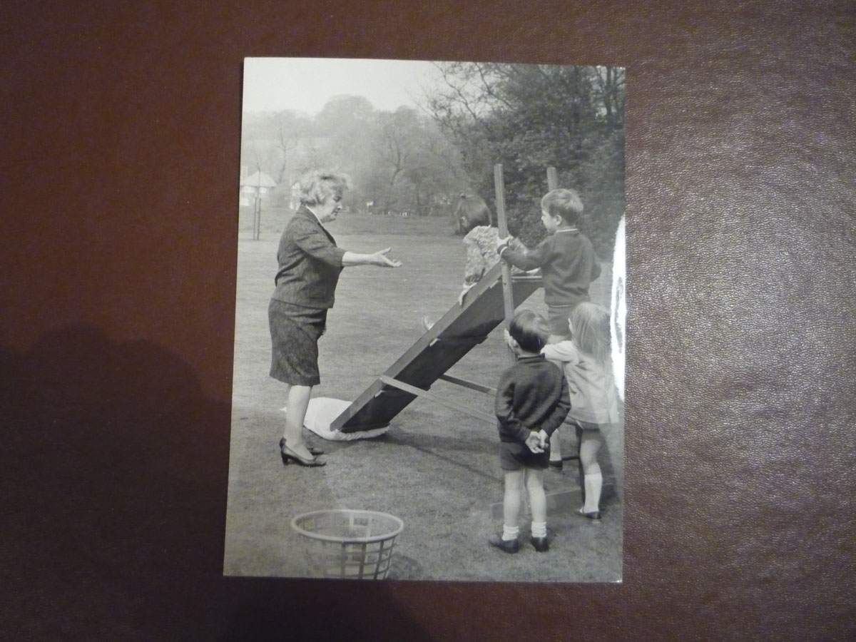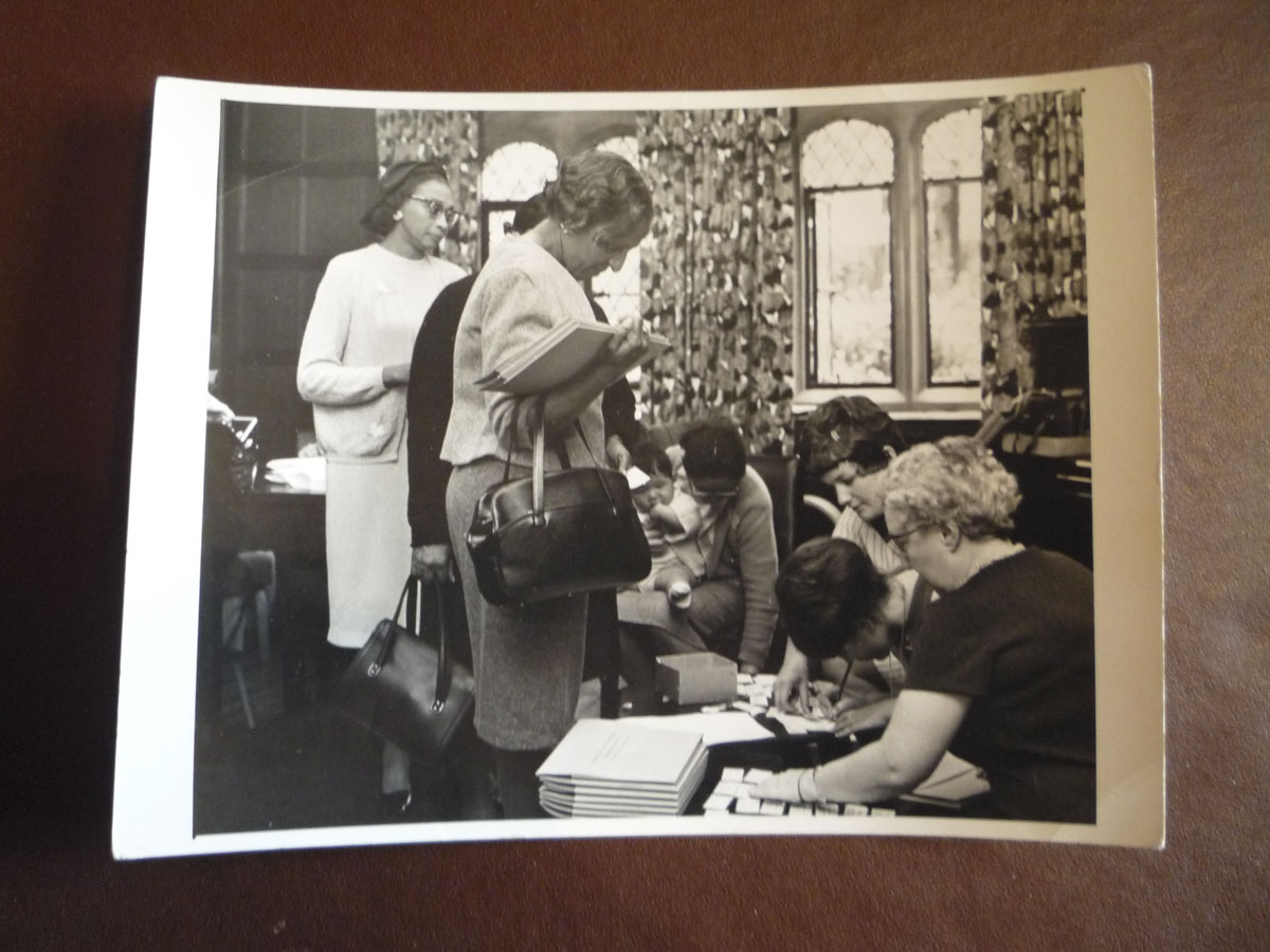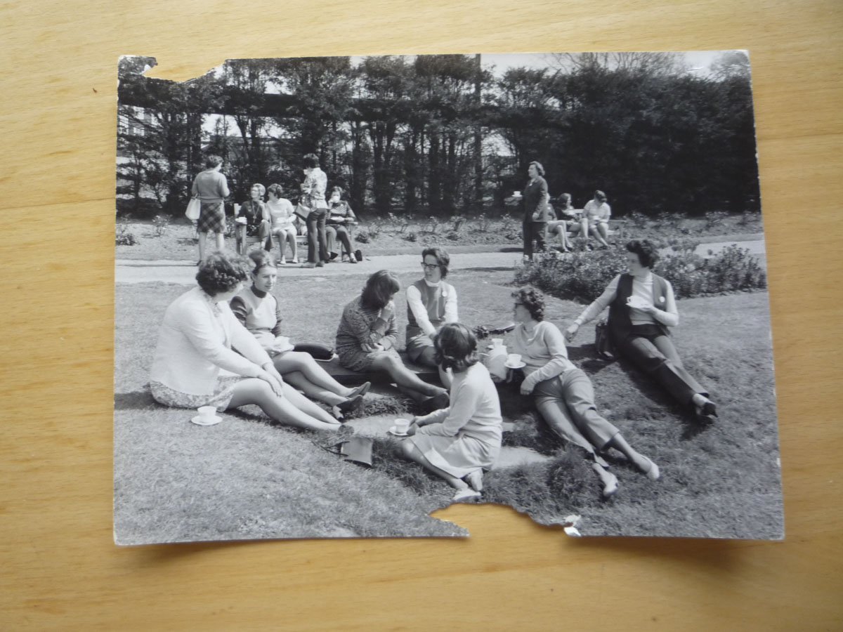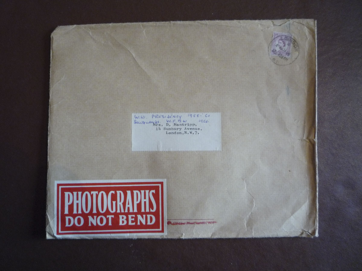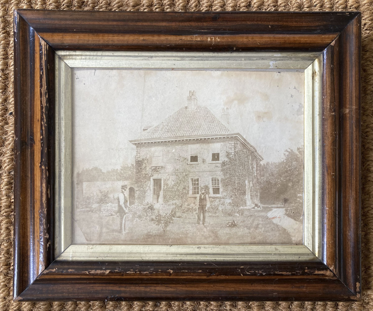 Framed black and white photograph, depicting the Old Rectory at Epworth from the side. On the lawn in front of the building stand two workmen. On the sides and to...