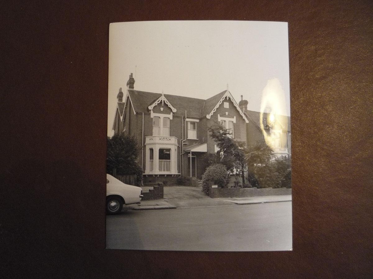 Framed colour photograph, depicting the Old Rectory at Epworth from the road. In front of the building is a low brick wall . To the sides of the building is...