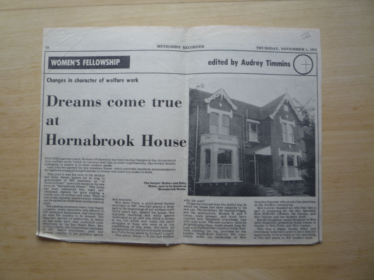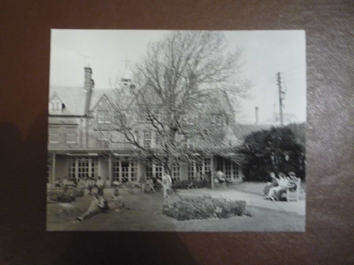 Framed black and white photograph, depicting the Old Rectory at Epworth from the side. On both sides and to the front of the building is greenery.