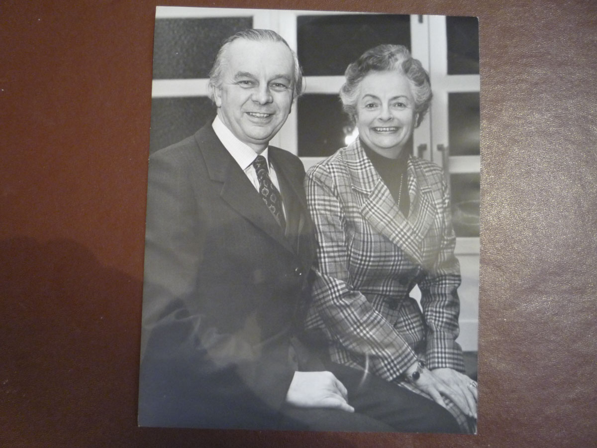 Framed sepia coloured photograph, depicting the Old Rectory at Epworth from the side. A man and a woman are sitting in front of the building by the door. There is...