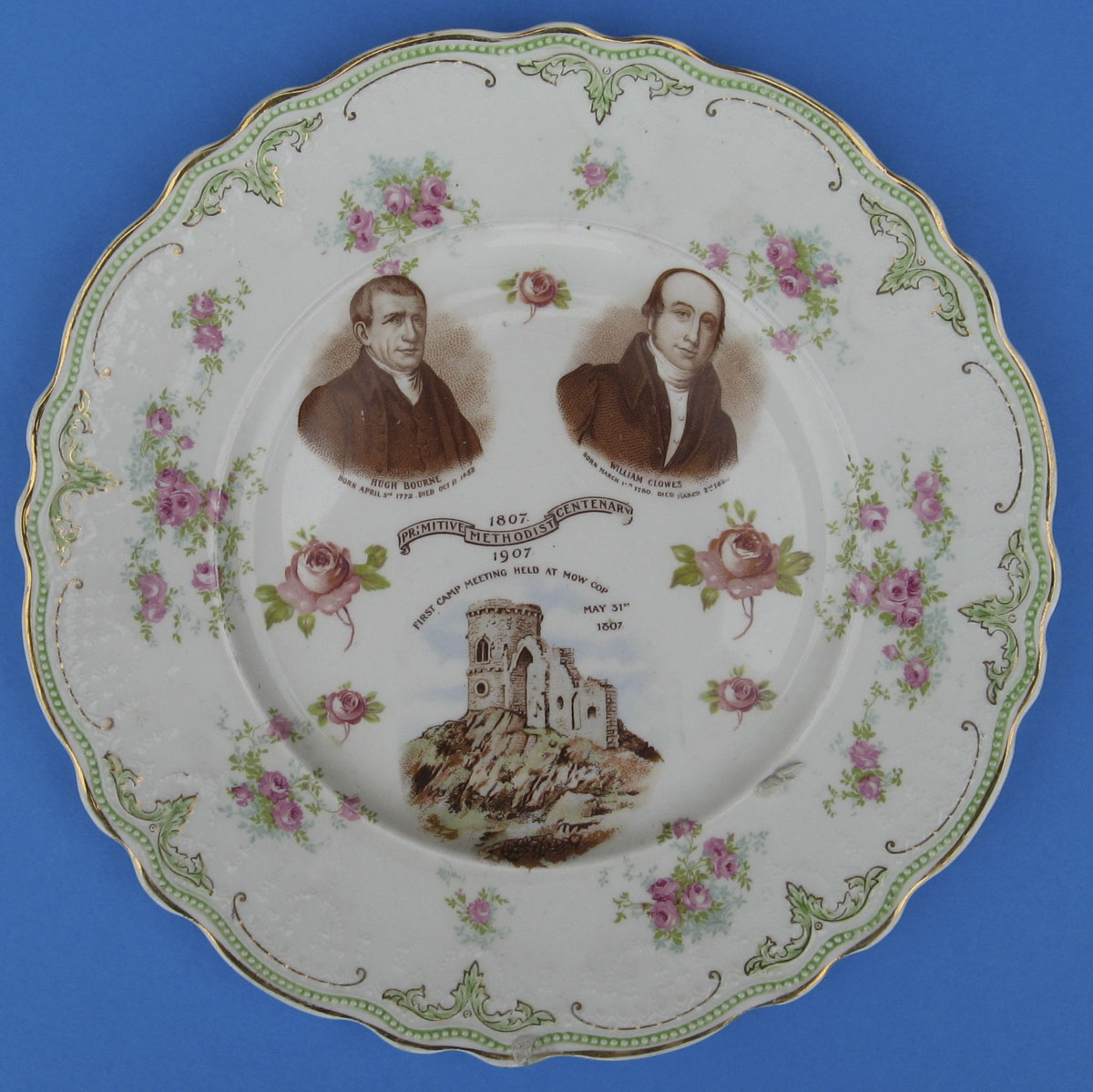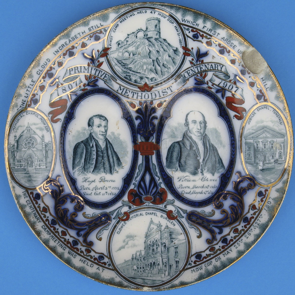 Round plate with 4 blue lithograph portraits and 5 pictures. Clockwise from top. 1. Portrait of James Bourne. 2.A picture of Mow Cop Chapel. 3. A portrait of William...