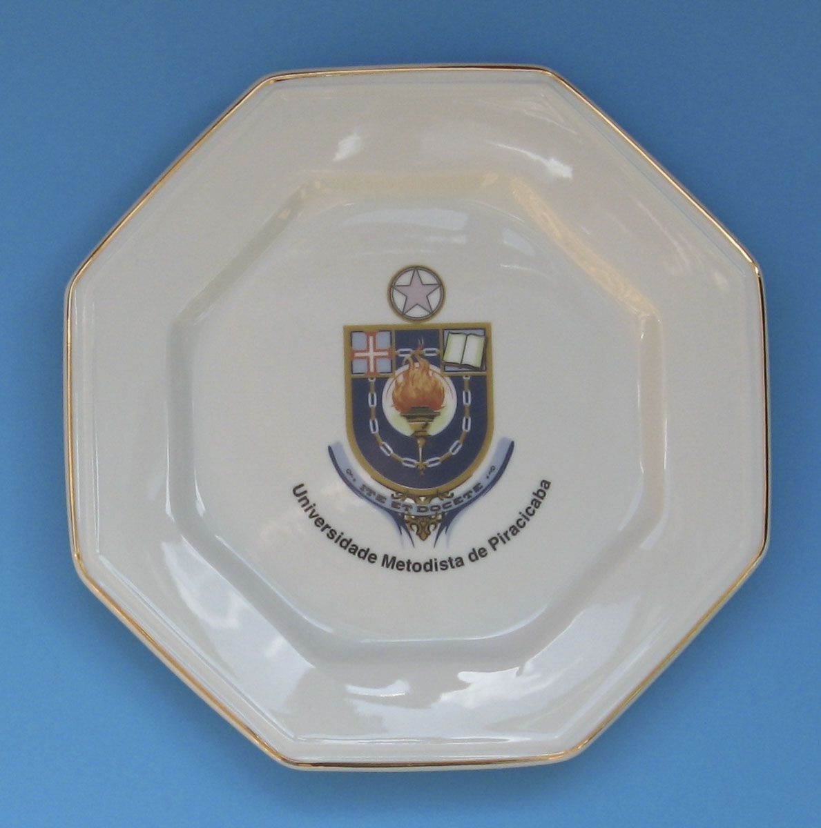 Porcelain octagonal plate with a coat of arms on a shield, Universidade Metodista De Piracicaba, Brazil. Gold line around the edge of the plate.