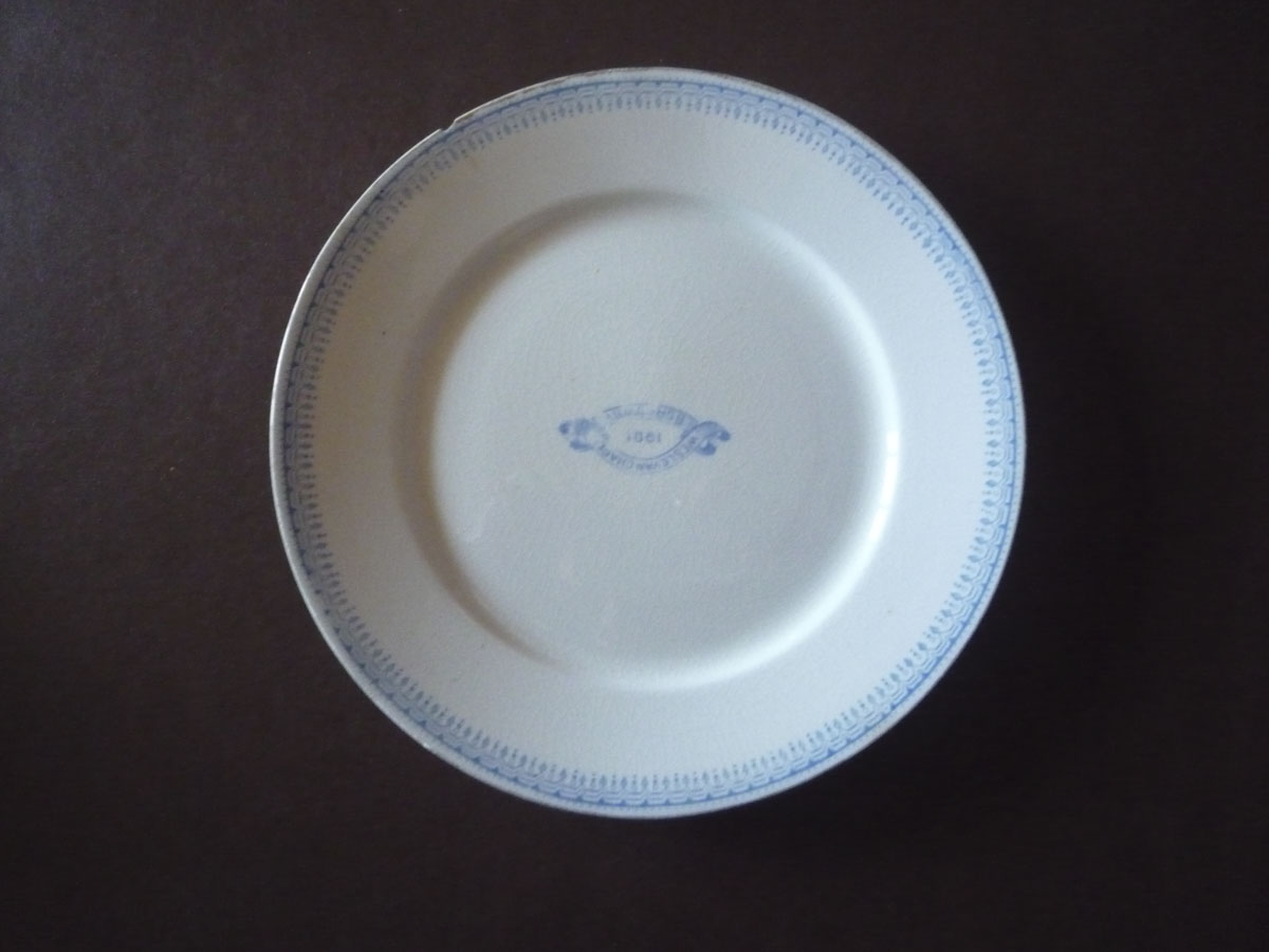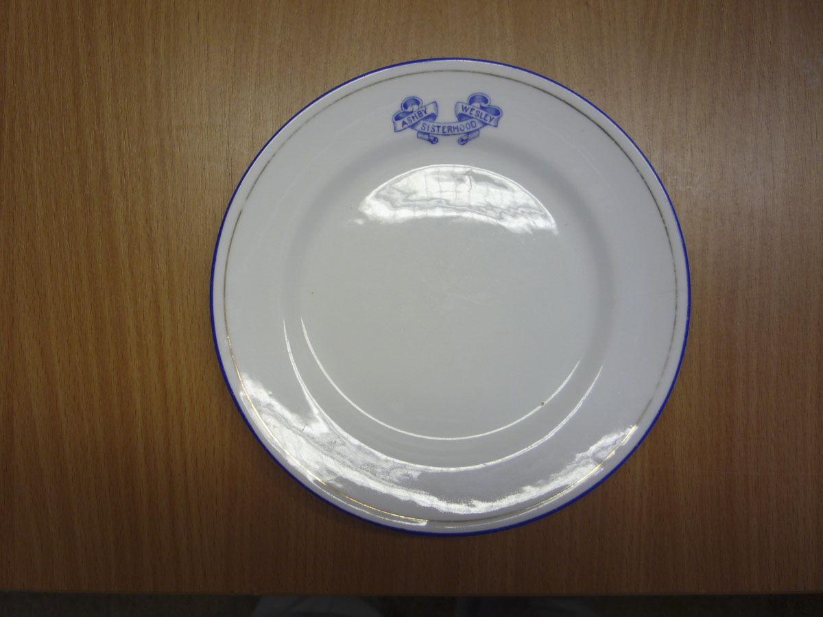 Earthenware round plate. There is a black line round the edge with 3 inner black lines. There is a black buckled belt with an inscription in black.