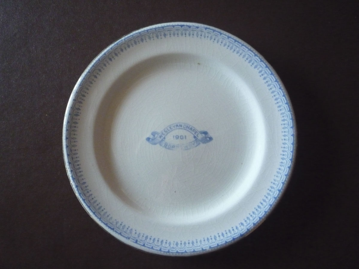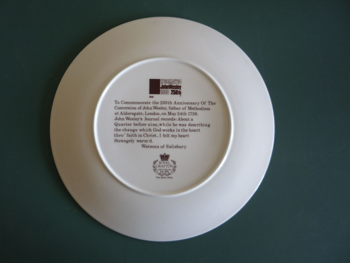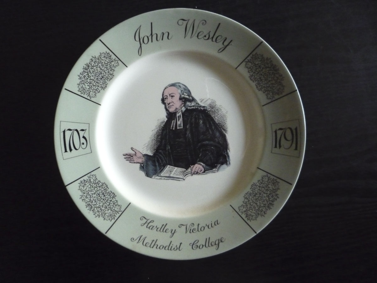 Round plate with a scalloped edge. In the centre is a picture of a bible on a stand surrounded by rays of sunlight with the words "Rev. John Wesley...