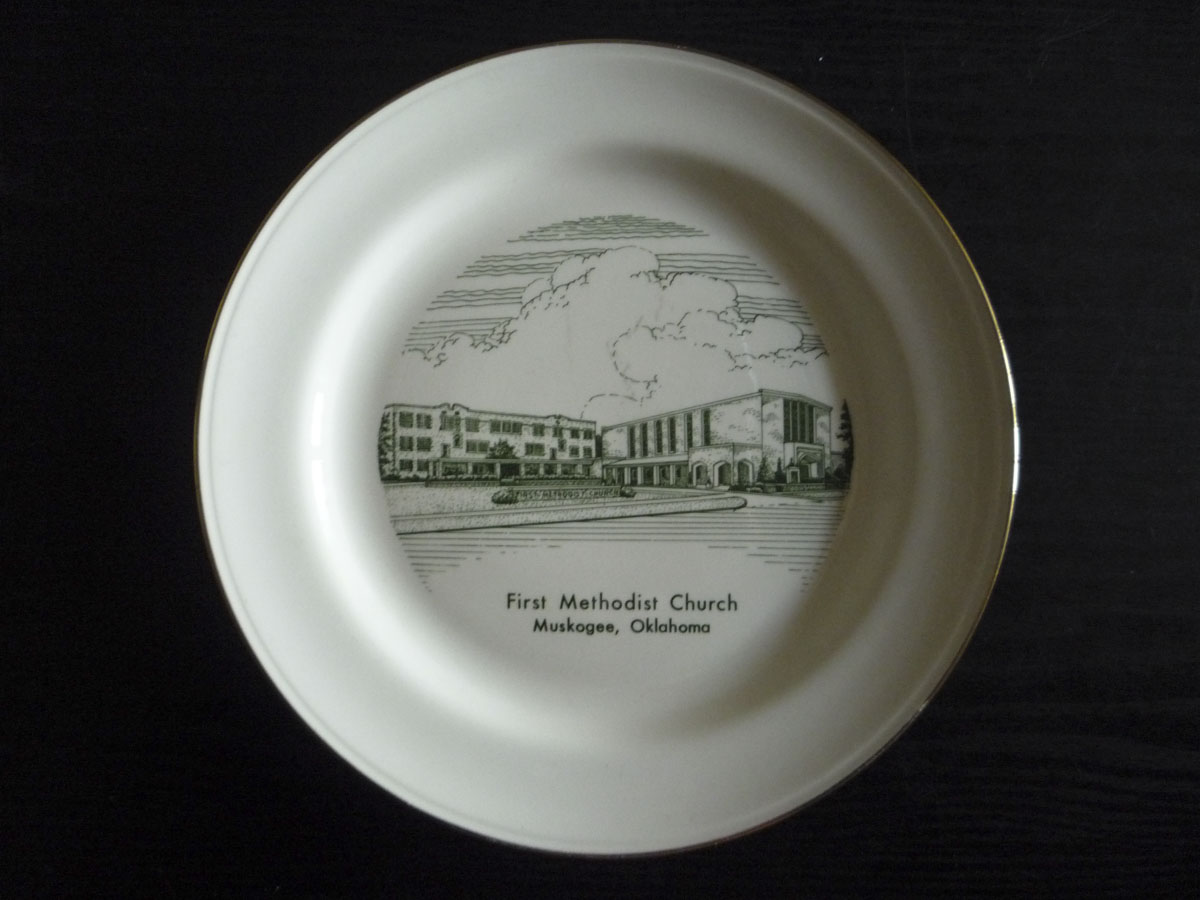Round plate with a gold border. In the centre is a lithograph picture of the Church, with the legend "First Methodist Church Muskogee Oklahoma" On the reverse there...