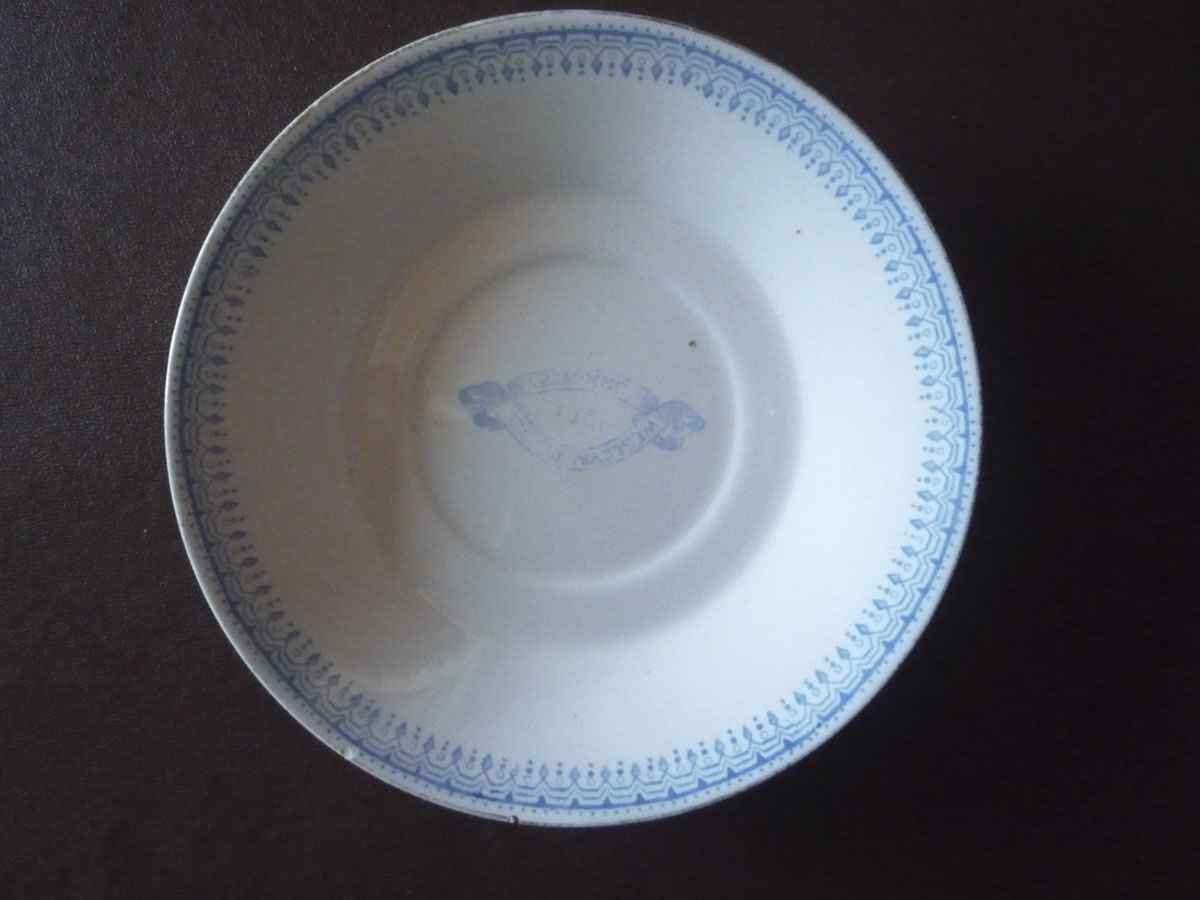 Earthenware round wavy edge sauced decorated with a pale violet transfer of a Chinese scene and a black print inscription