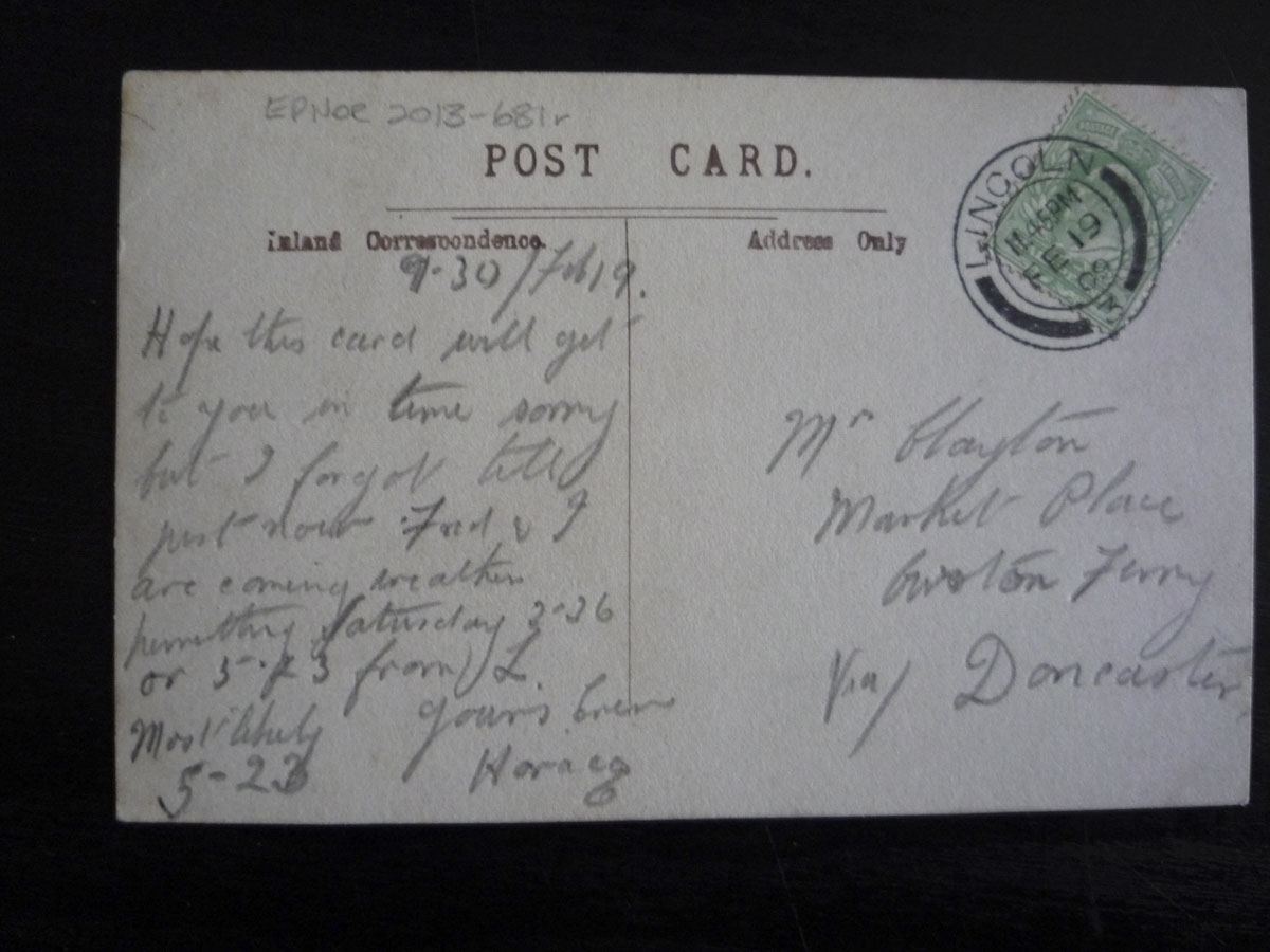 postcard - Market Place in Epworth, postmarked Aug 31 1909