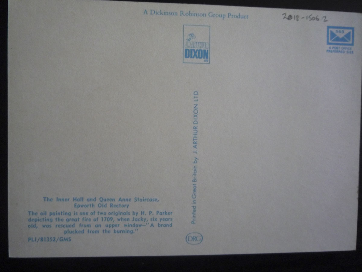 postcard showing the Staircase in the interior of Epworth Old Rectory