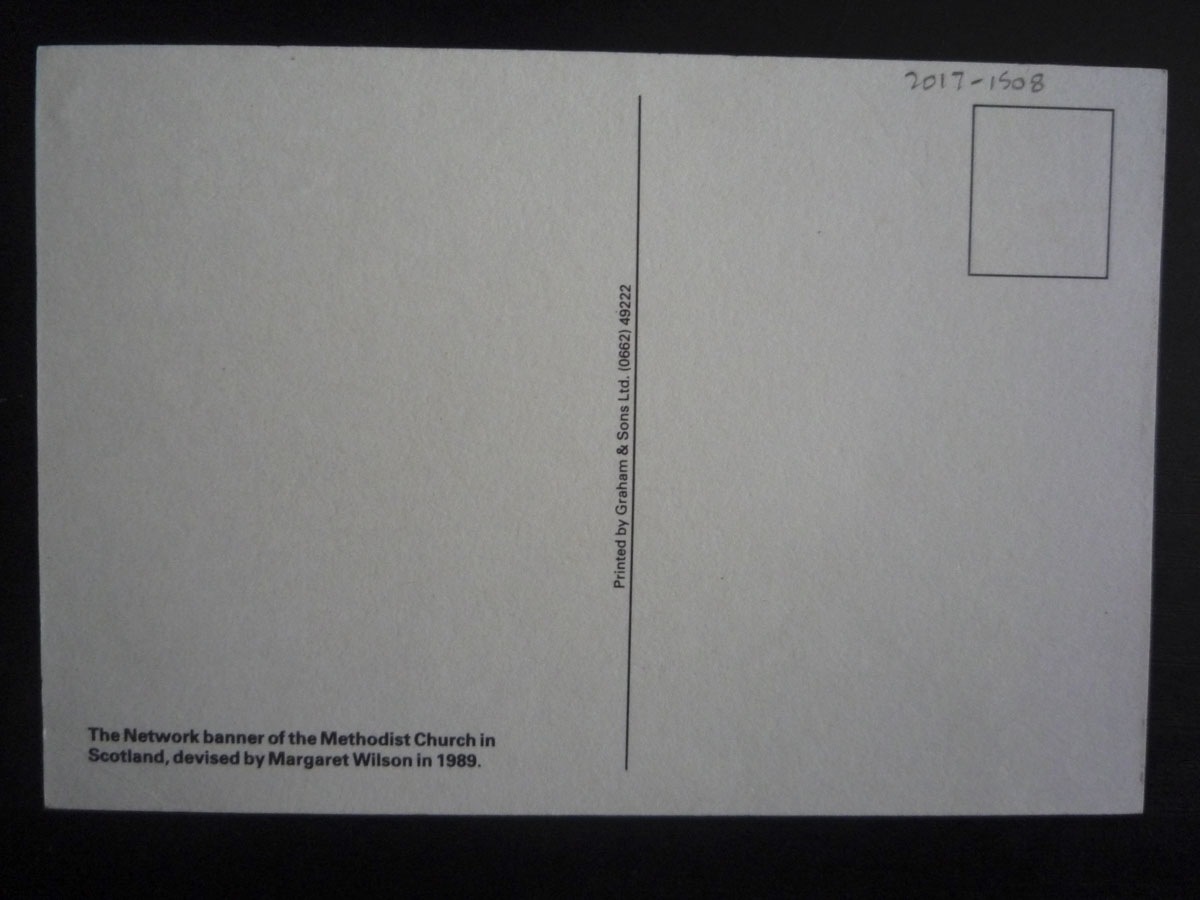 postcard - depicting a drawing of John Wesley, James Hamilton and Joseph Cole walking down the street in Edinburgh, including a quote from John Wesley