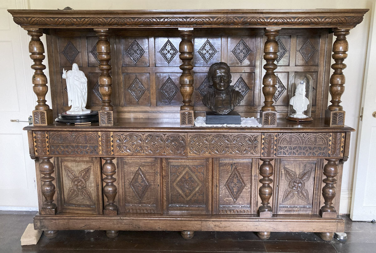 Large oak sideboard with 2 sections. The lower section has 4 drawers with carved lunette and circular motives. The two outer drawers have dark and light wood triangular patterns. Brass locks are fitted with brass screws. There are 4 cupboards with carved doors and a central fixed carved panel. The doors have brass hinges, iron locks and brass keyhole inserts. The two outer doors have 4 leaf floral designs, the 2 inner doors have carved narrow diamond design and the inner panel has a carved square diamond design. There are 4 split baluster supports and 5 bulbous turned feet at the front and 2 at the back. The upper section has a swell frieze with carved stylised foliage supported by 5 bulbous cup and cover turned uprights. The back panel is comprised of 16 square panels each having a carved flower design within a diamond pattern.