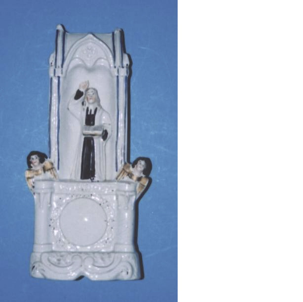 Earthenware flat-back Gothic style ornament with a figure of John Wesley standing under a canopy and above a clock with no numerals. There are 4 roundels on the canopy and the base is in a rococo style. The figure of John Wesley has a cherub with black hair at either side. The white ornament is highlighted in blue and gold. The figure of John Wesley is in the manner of the R.Owen sculpture of Hull drawing 1856. The grey hair is in a single roll resting on the shoulders.The face and hands are flesh coloured. The pupils, eyelids and eyebrows are black the cheeks are pink and the lips are red. The cassock is full length and black. The cravat is white and bands come out of the top. The gown is full length and white with gold highlighting. The shoes are black. The right hand is held above the head and the left hand is holding a book( the bible) at waist height. There are black marks on the open pages with green edges. On either side of the platform there is a winged cherub with black hair, eyebrows, eyelids, blue eyes, red lips, pink cheeks and gold painted wings