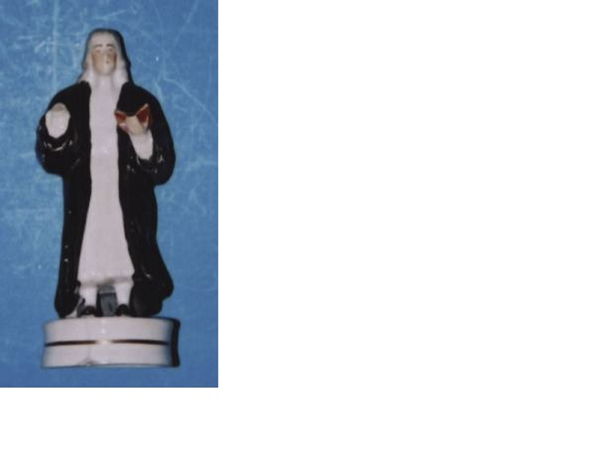 Earthenware figure of John Wesley in the manner of Minton shape 47. The hair is styled in a single roll at each side. Extending from this and at the back the hair hangs straight to the shoulders in curls and is coloured grey. The face is flesh coloured, the pupils are black, the eyebrows are black. The cheeks are pink and the small lips are red. The white cassock is calf length and there is a white cravat and cummerbund. The bands come from the top of the cravat. The legs have white stockings and the shoes are black. The right hand is missing but should point forward and the left hand is under a part open book (Bible). The book is open and has a red cover. The base is round,concave and painted with a gold line.