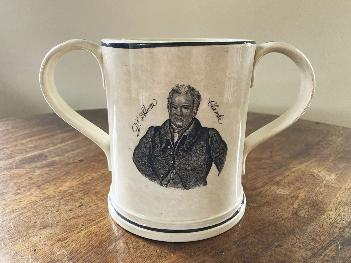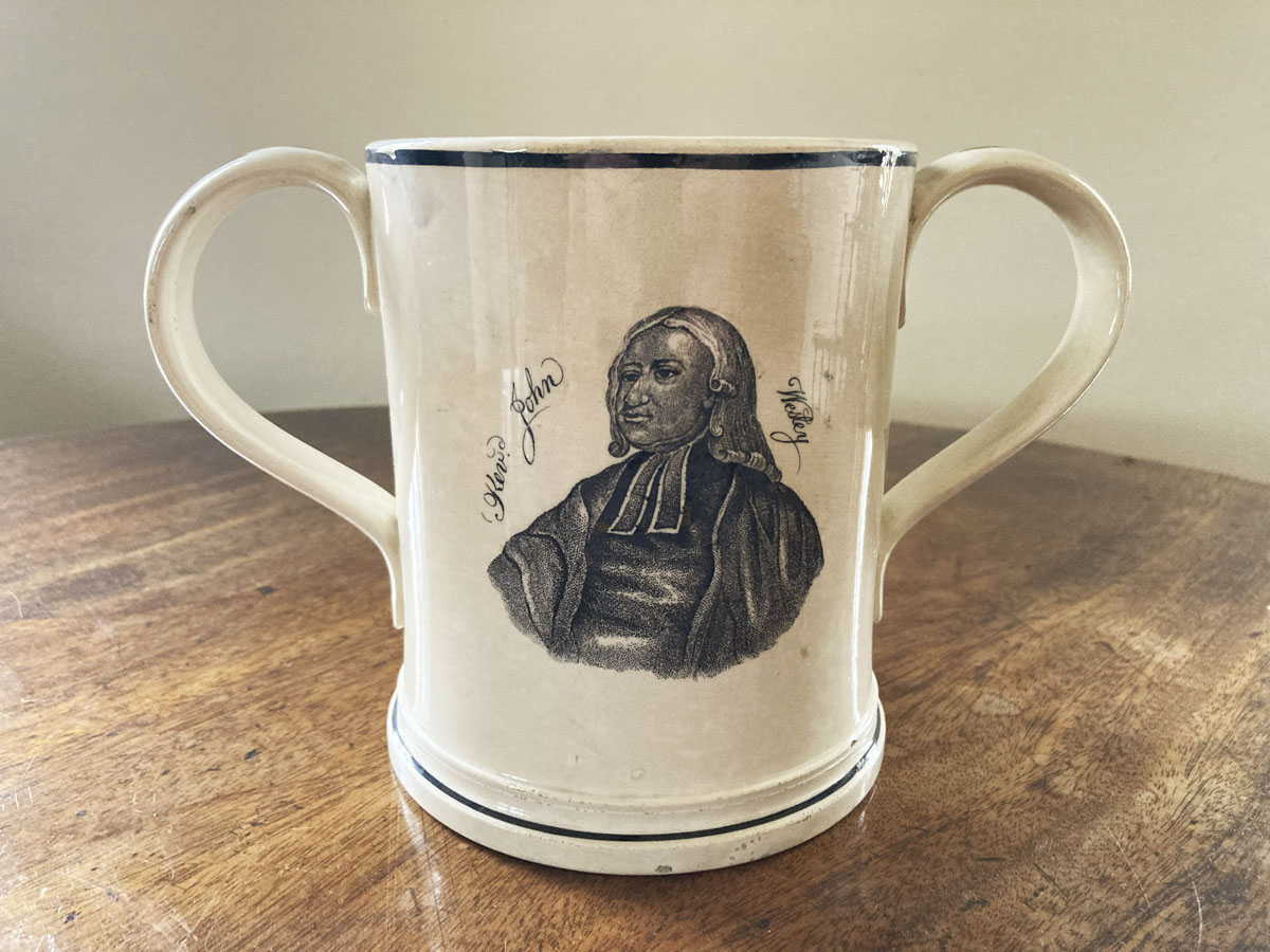 White earthenware love feast cup. Straight sided body with black lines outside the rim and base, with two loop handles. Transfer print 1; half length portrait of John Wesley looking 3/4 front left, in the manner of John Jackson RA (1778-1831) portrait, 1827. Wesley wears a black cassock and gown with a cravat and preaching bands coming from the top of the cravat. Transfer 2; half length portrait of Adam Clarke in the manner of John Jackson RA (1778-1831) wearing a black waist coat and jacket with a white shirt and cravat.