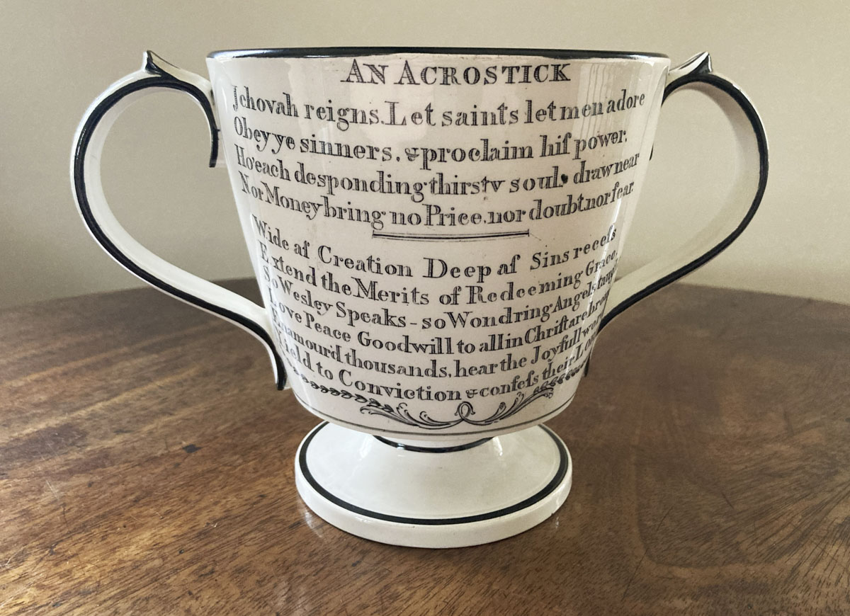 Earthenware love feast cup, with two handles. Straight, slanting, sides with black line around the rim, lower body, waist and base. On one side a transfer print of the half length profile of John Wesley, looking left in the manner of Henry Edridge ARA (1769-1821) painting (1790). Wesley is wearing a black cassock and gown with a cravat and preaching bands coming from the top of the cravat. There is a semi circle around the image, made in a floral design with an inscription in it. On the reverse is an inscription, with a floral design underneath.