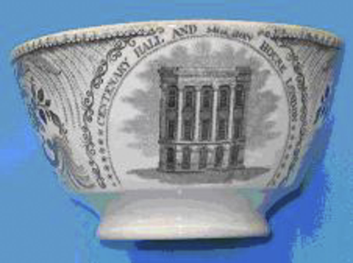 Earthenware round bowl with black transfer prints of John Wesley on one side and the Centenary Hall on the other. All around are doves and floral sprays. Inside the bowl is a 14 pointed star and in the centre is a dove with an olive branch in its beak. The obverse is a half-length profile of John Wesley looking left in the manner of the Henry Edridge ARA (1769-1821) profile (1790) with an inscription. On the reverse is a black transfer print of Centenary Hall with an inscription.