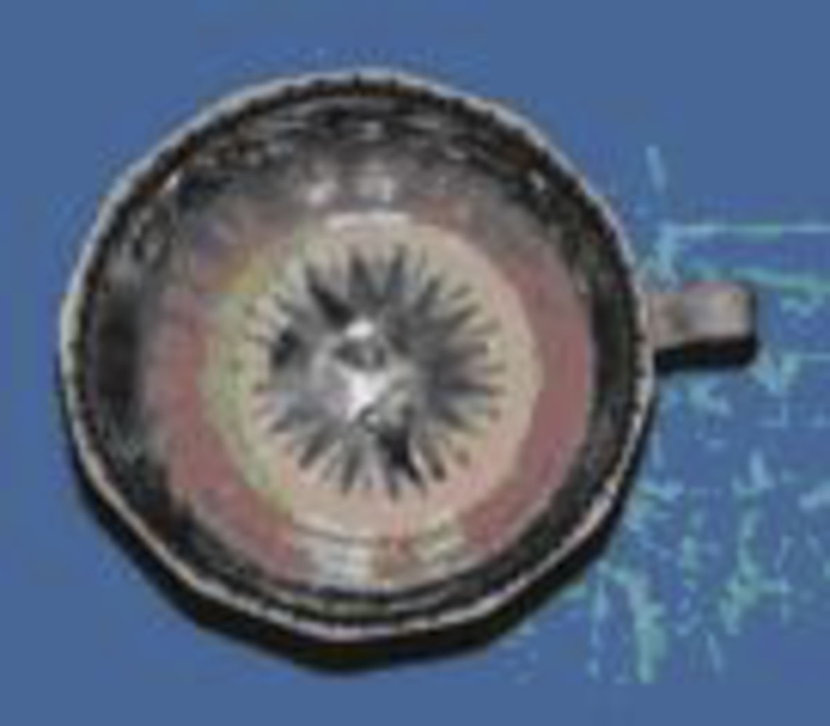 Earthenware 12 sided cup with black transfer prints of John Wesley on one side and the Centenary Hall on the other. All around are doves and floral sprays. Inside the cup is a 14 pointed star and in the centre is a dove with an olive branch in its beak. The obverse is a half-length profile of John Wesley looking left in the manner of the Henry Edridge ARA (1769-1821) profile (1790) with an inscription. On the reverse is a black transfer print of Centenary Hall with an inscription. The handle is angular with rounded top and bottom.