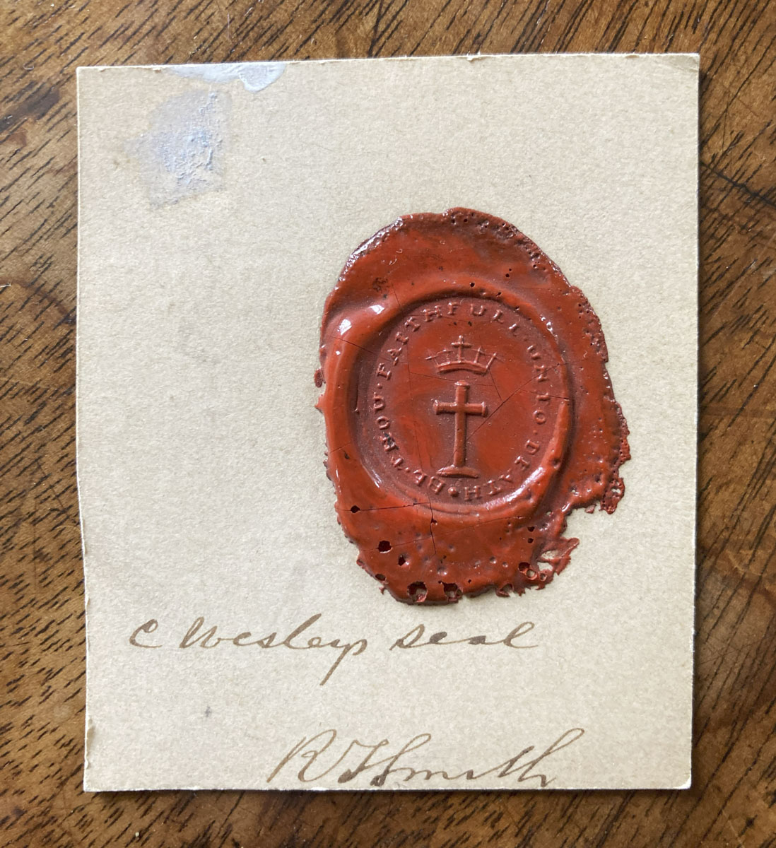Cream card containing an impression on an oval of red sealing wax. The impression is from Charles Wesley's personal seal and is a cross with a crown above.