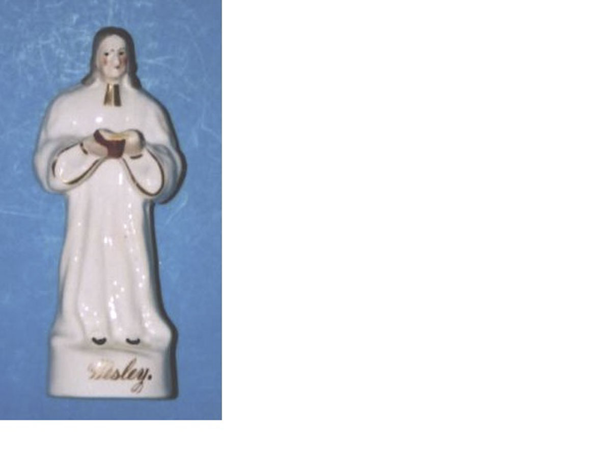 earthenware figurine of John Wesley on an integral round solid base. The back is a solid flowing gown. The hair is styled with a single roll at each side. At the back and extending from the single roll at the sides grey hair hangs to the shoulder in curls. The face is lesh coloured with pink cheeks and 2 red dots for nostrils. The pupils of the eyes are black and the eyebrows grey. The lips are red. The cassock is white and reaches down to the black shoes. Gold bands come from the top of the cravat. The gown has gold edged sleeves with flowing folds which reach the base at the sides and back. The shirt is white with gold cuffs. The hands are flesh coloured and hold a book( Bible) which is open with a red cover, yellow edges and black lines on the pages.