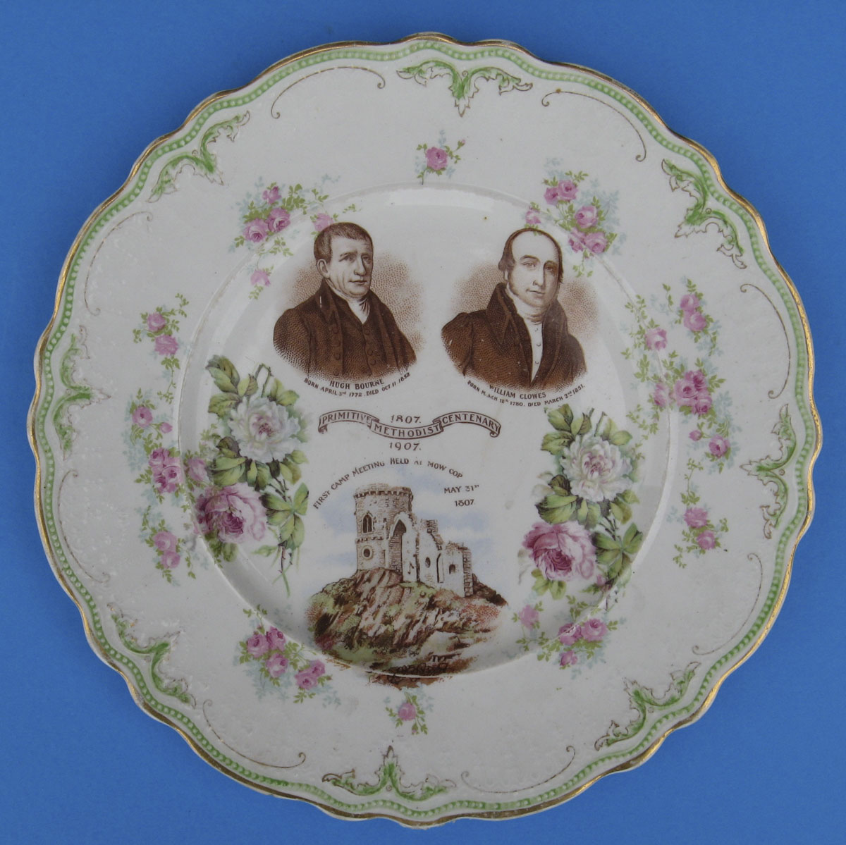 Round plate with alternate small and large wavy edge. The edge is painted gold with an inner green band highlighted with a thin gold line and green floral designs. The inner side of the plate is decorated with red roses and there are red roses around the sepia lithographs. The lithograph prints are portraits of Hugh Bourne and William Clowes and a lithograph of Mow Cop Hill top.There are title inscriptions under each image.