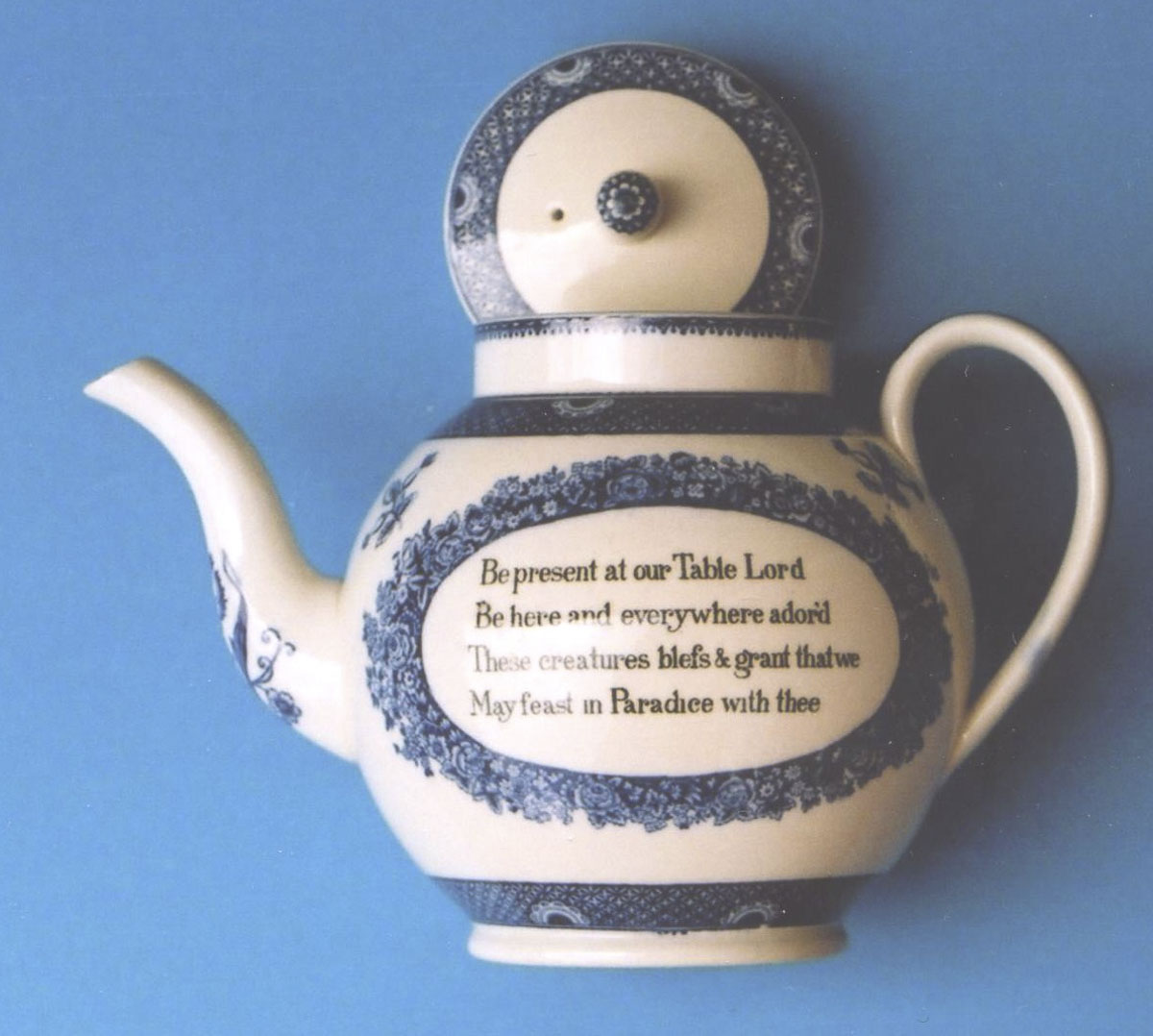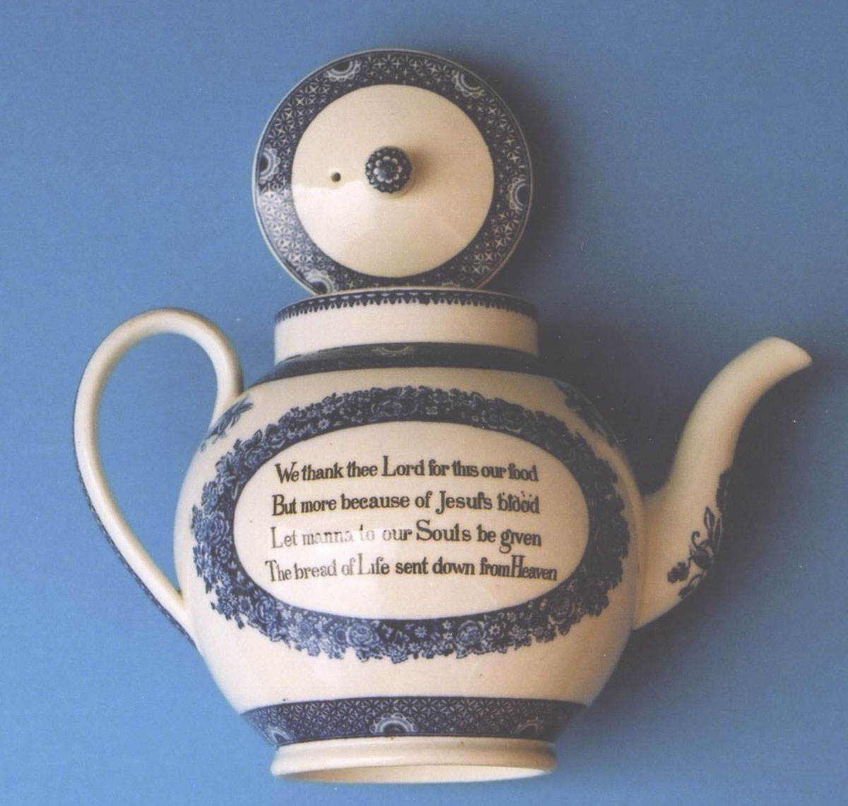 Earthenware teapot with a lid. Blue transfer printed geometrical decoration around the top of the body, top rim and handle. Either side of the spout and on the spout, blue transfer flowers. Either side of the body is a blue transfer oval decoration containing a black transfer verse by Jon Cennick (1718-1755). Earthenware lid. Blue transfer geometrical decoration in a border around the top and a flower on the knob. There is a small round air vent hole.