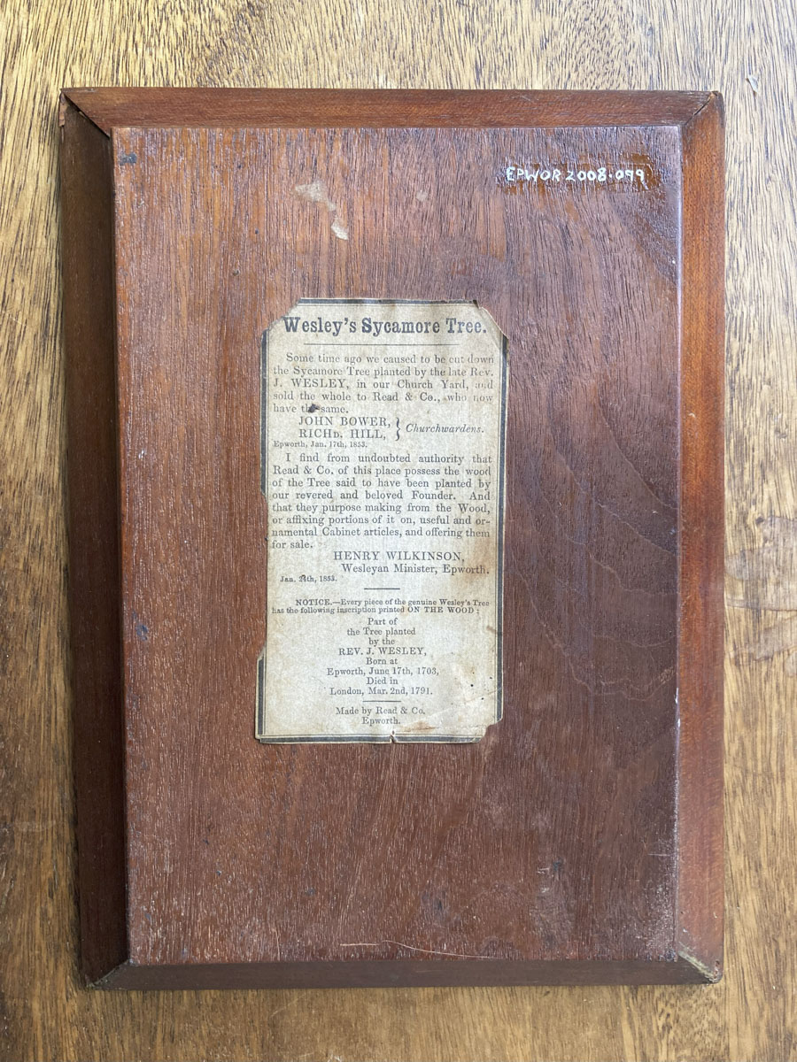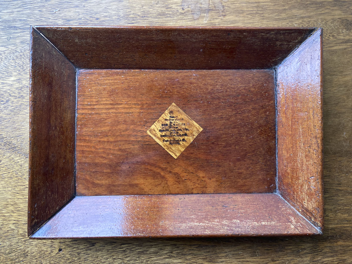 Wooden oblong tray made from a sycamore tree planted by John Wesley. There is a light coloured wood diamond plaque with an impressed inscription and a further paper label underneath
