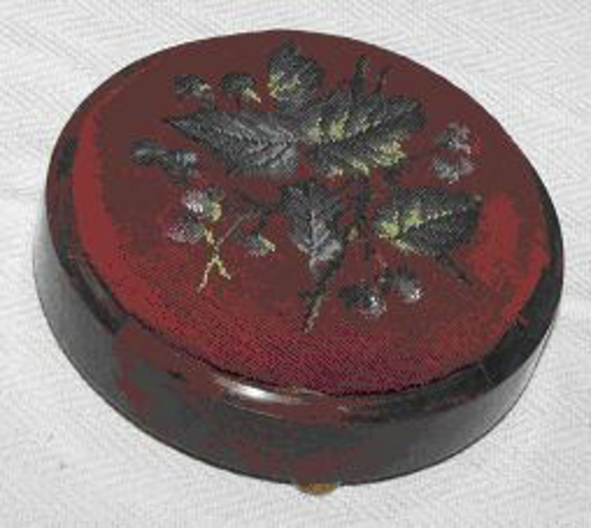 Circular mahogany veneer footstool with coloured wool and bead tapestry with a blackberry design on a red background. The tapestry is attached to the frame over padding. There are no legs but there are 3 round flattened ball feet.