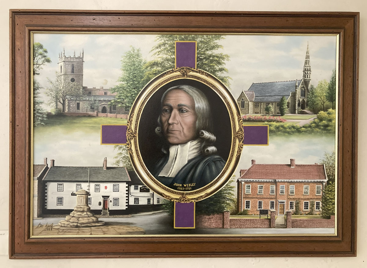 John Wesley is depicted in clerical dress, facing 3/4 front right. He is shown in an oval, superimposed on a purple cross and surrounded by four views of Epworth. (top left) St Andrew's Parish Church (top right) Wesley Memorial Methodist Church (bottom left) The Red Lion Hotel and the Market Cross (bottom right) Epworth Old Rectory