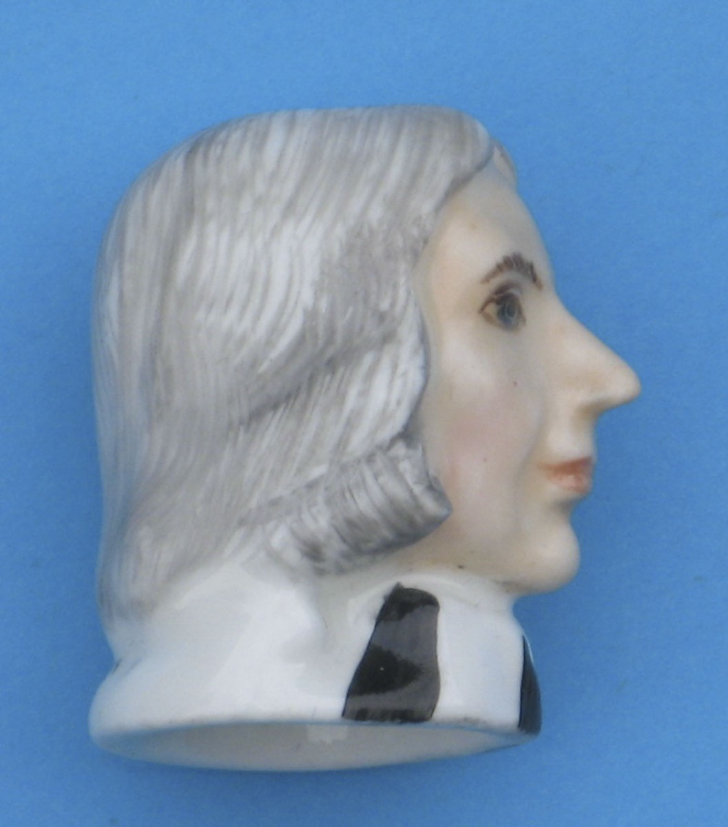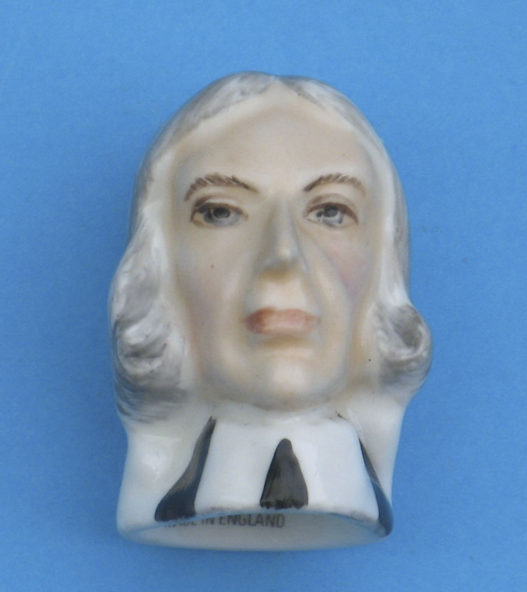 Bone china glazed candle snuffer in the shape of John Wesley's head and under glaze painted. The hair is grey styled in a single roll on each side. The face is flesh coloured with pink lips and cheeks. The pupils are black with white irises and grey eyebrows. The cassock is black, there is a cravat and there are bands coming from the top of the cassock. There is a hinged presentation box covered in blue material with a gold line.