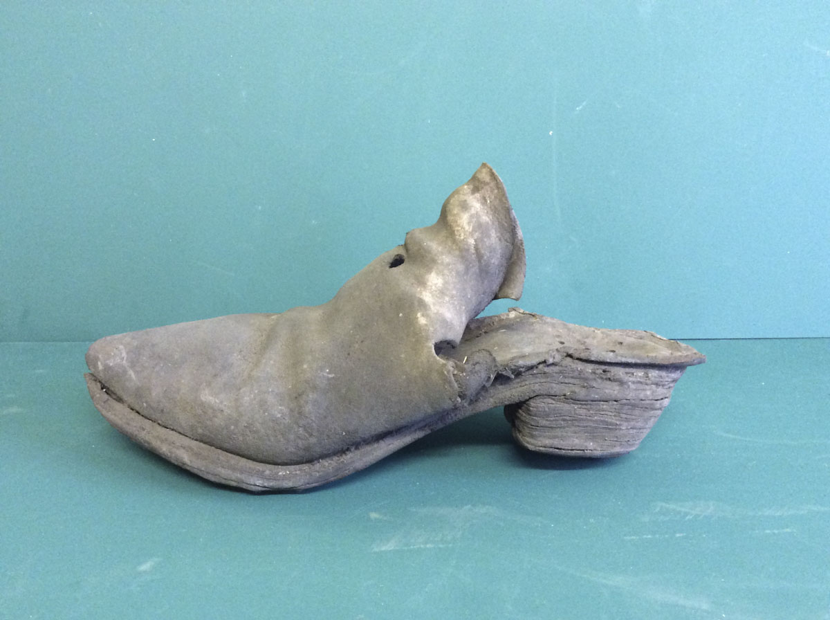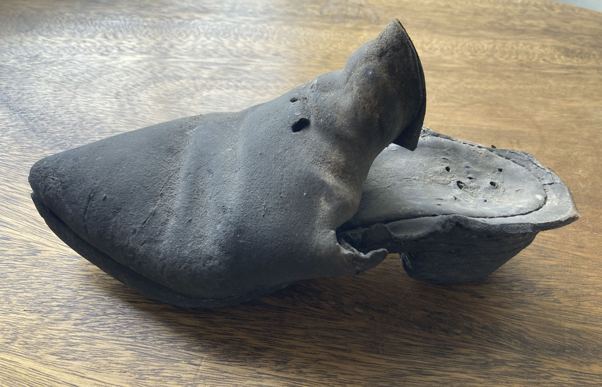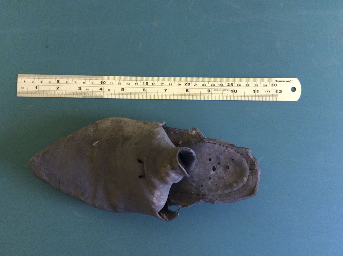 Late 17th century "concealed" shoe found in a void above the ground floor fore-kitchen, thus under the floorboards of the first floor and close to the central fireplace. It was discovered when the rectory was being renovated in 2013 as part of the project called "Put the Hearth back in the Home". It has a leather front piece with 2 holes presumably for a buckle, a pointed toe, stacked leather heel of over 1 inch, repair to the side (possibly for a bunion) and the heel section has been cut away at some point to make a mule like shoe or fit a second owner. It was found with a piece of twisted woody plant that has been deliberately twisted into a shape (see 2013-699) Research indicates that the practice of concealing shoes in buildings is probably the most common superstitious practice of the post mediaeval period and this find ties in with other finds in 5 main ways. Firstly where the shoe was found namely close to the fireplace and in a void (not in foundations); secondly the associations with repair work as it is thought the shoe could have been placed in the void when the house was rebuilt in 1709 after the fire; thirdly, that the shoe is old and well worn; fourthly that it is a single shoe; and finally that it is often placed there with other items - in our case the twisted twigs. It is thought that sometimes workmen rather than owners are responsible for the concealment.
