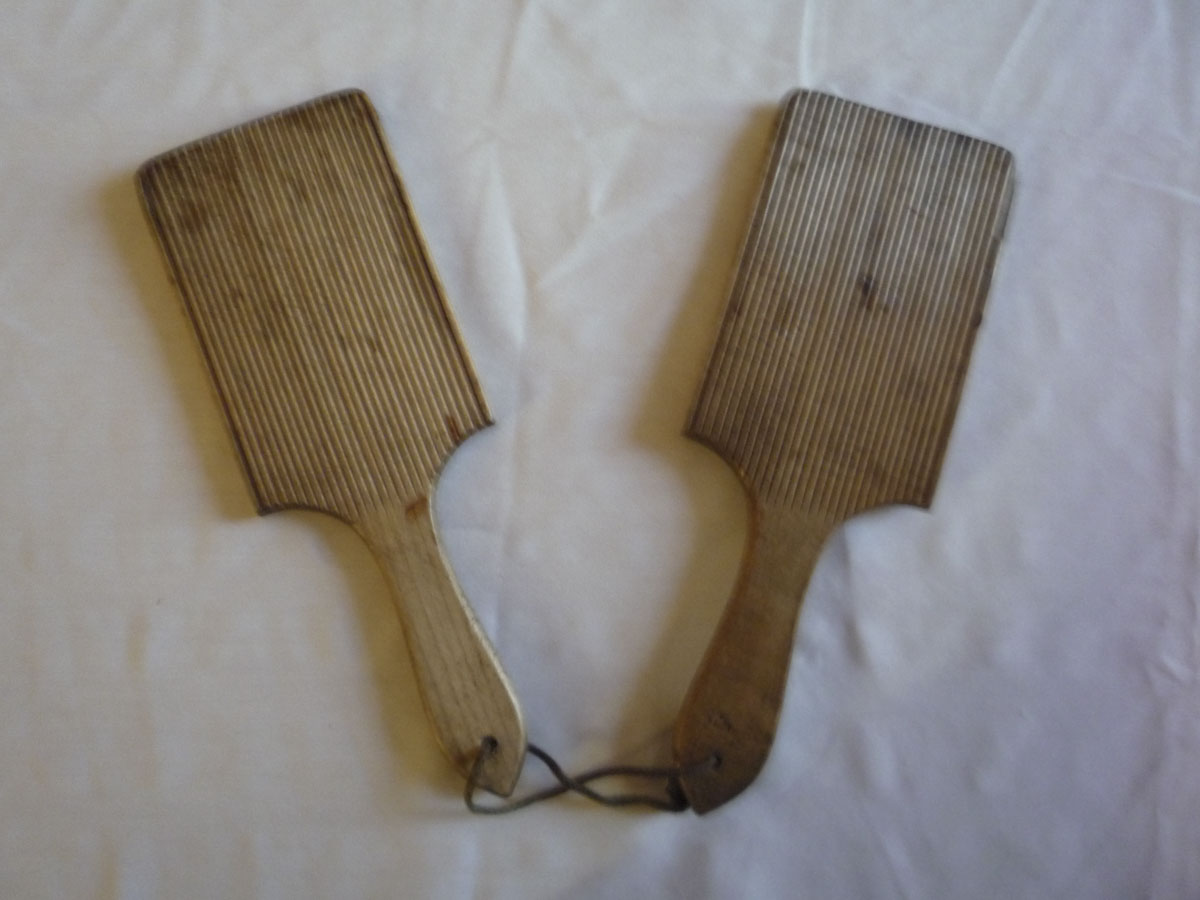 A pair of early wooden butter pats with smooth outer surface and ribbed inner surface