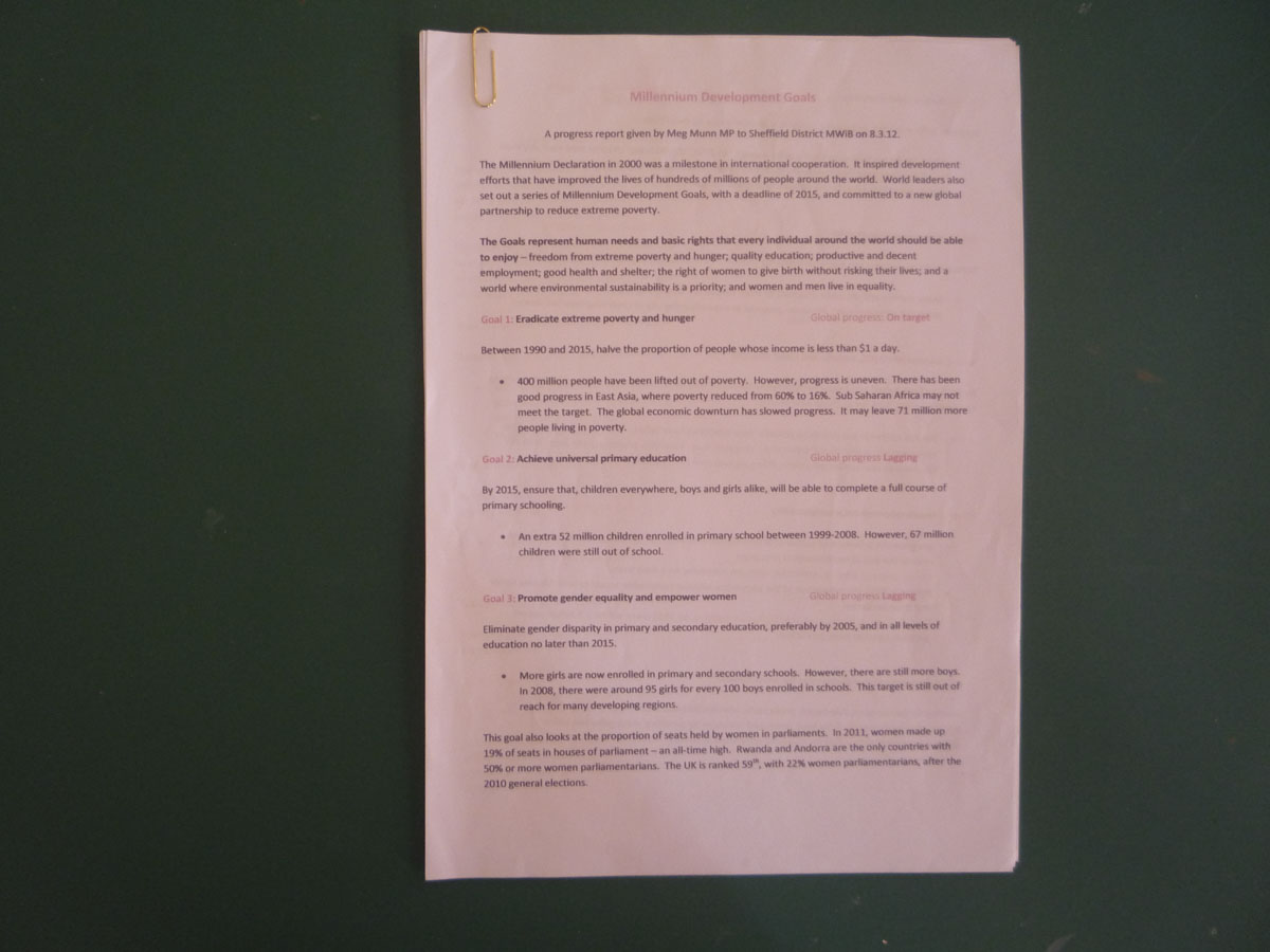Progress Report on the United Nations Millennium Development Goals given by Meg Munn MP to Sheffield District MWiB on 8.3.12