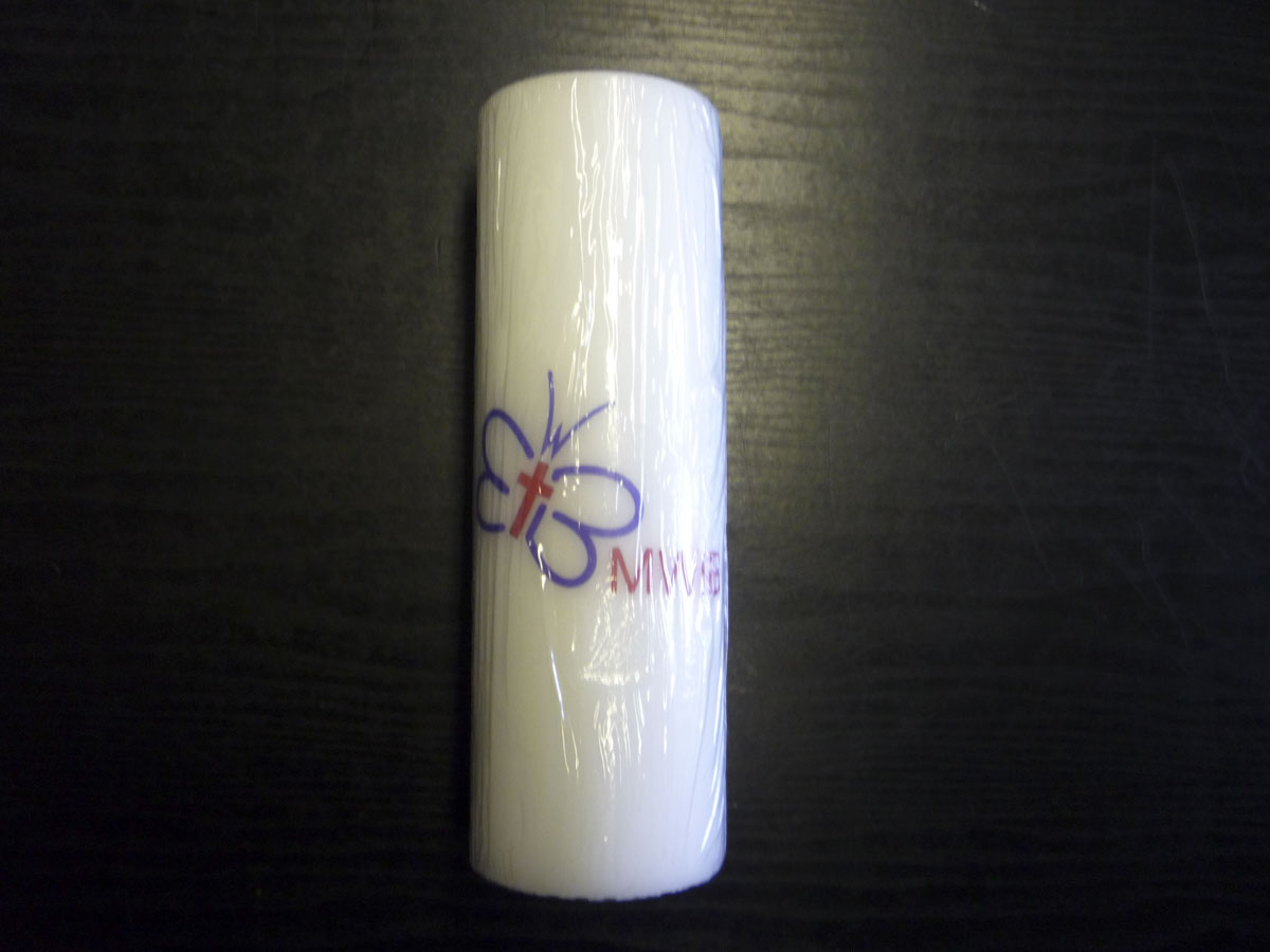 Large candle with MWiB logo and a wooden base