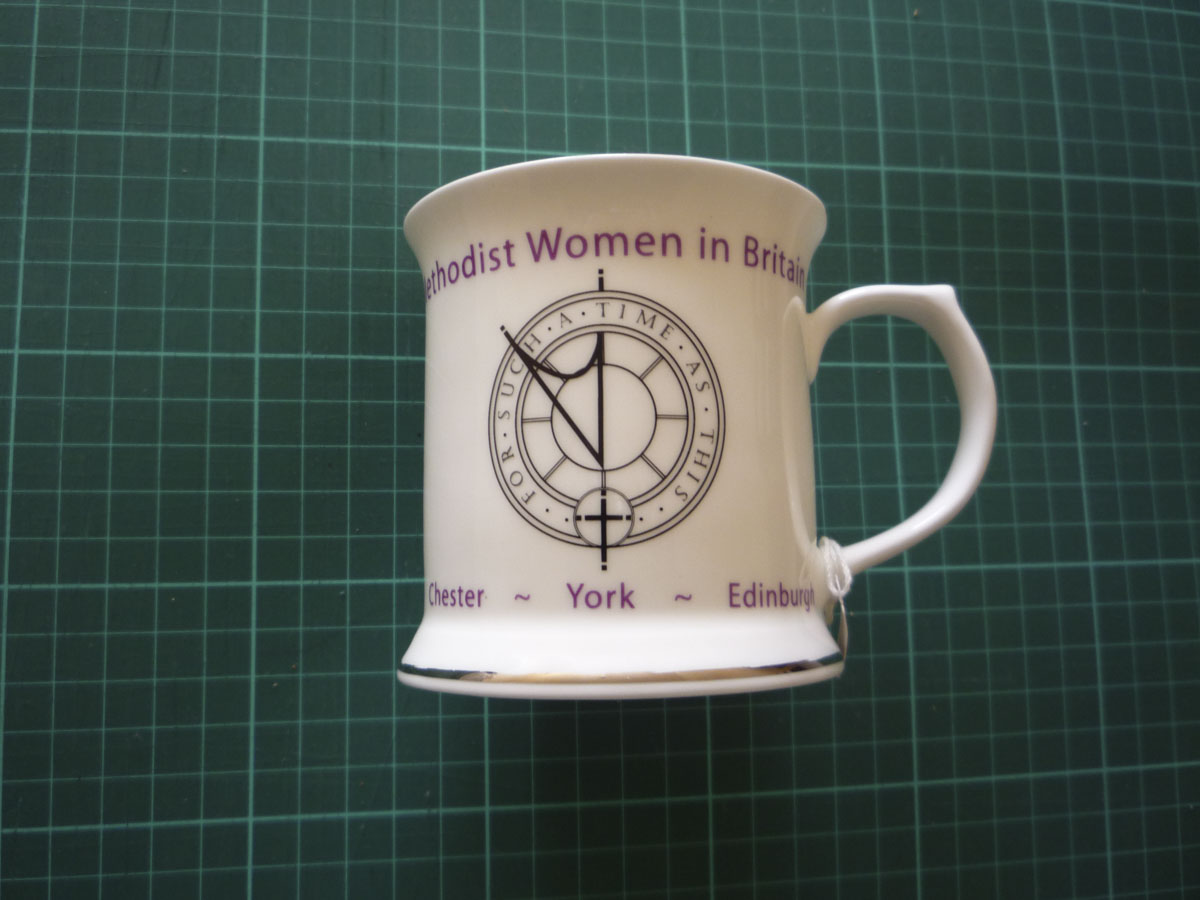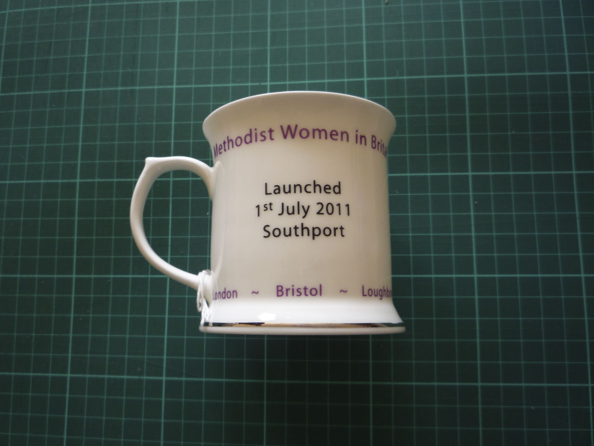 Souvenir MWiB china beaker with printing in black and purple with silver trim