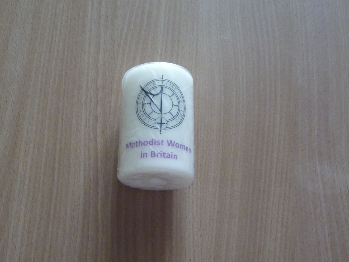 Souvenir MWiB candle in off white colour with purple and black printing.