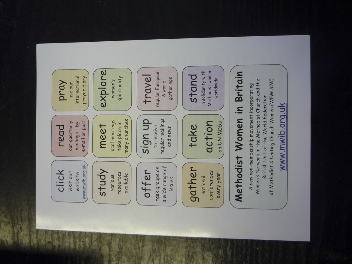 leaflet with coloured squares (click, read, pray, etc.) with information about different aspects of MWiB