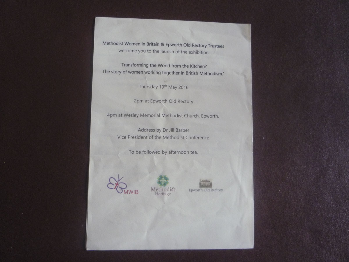 Programme for the launch of an exhibition at EOR - "Transforming the World from the Kitchen - The Story of Women Working together in British Methodism"